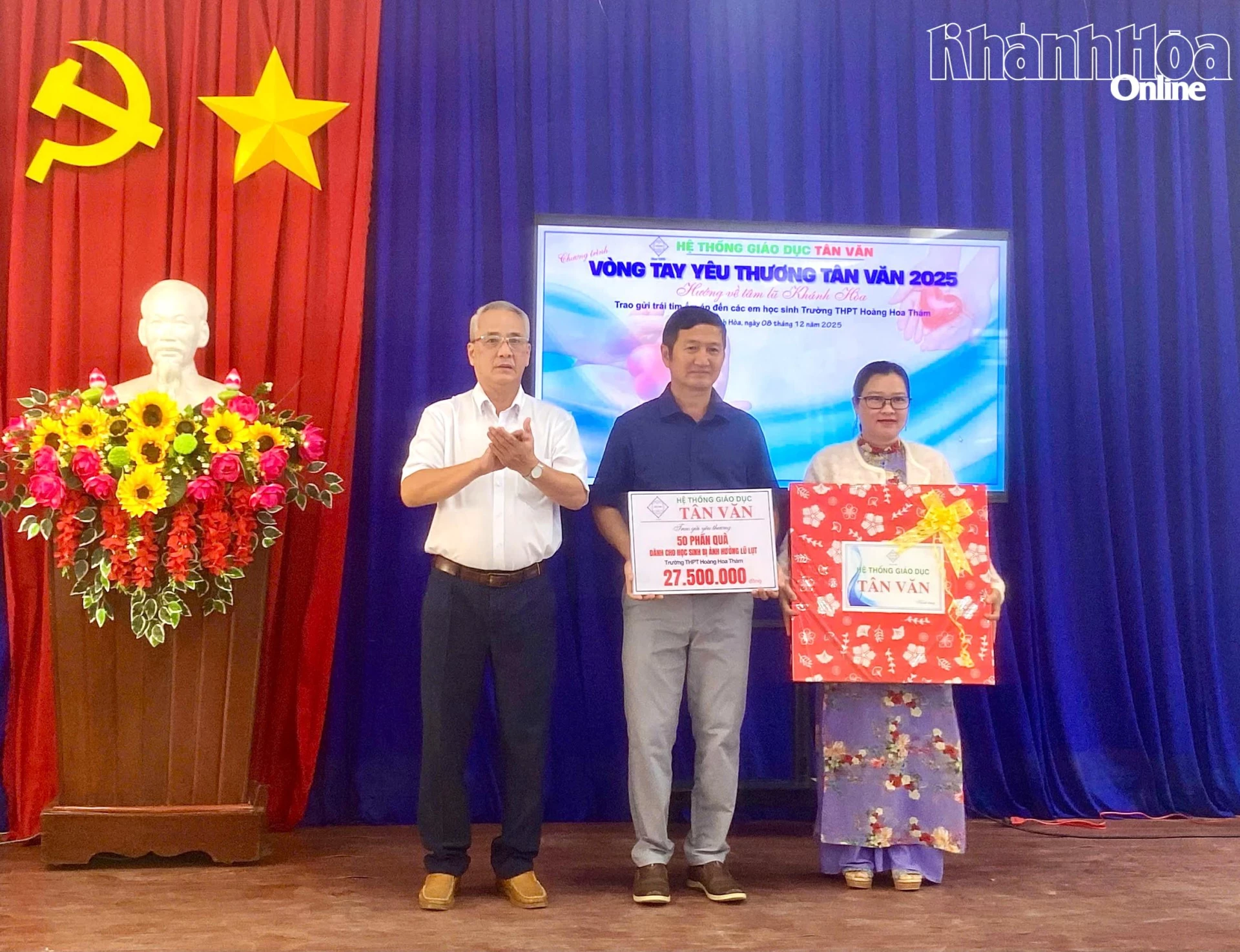 | نماینده هیئت، لوح نمادین حمایت مالی را به دبیرستان هوانگ هوا تام اهدا کرد. |