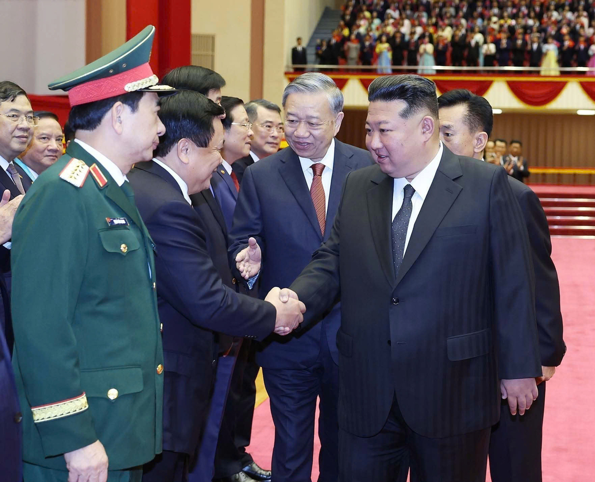 کیم جونگ اون، دبیرکل و رئیس کمیسیون امور دولتی جمهوری دموکراتیک خلق کره، از دبیرکل تو لام استقبال میکند. عکس: VNA