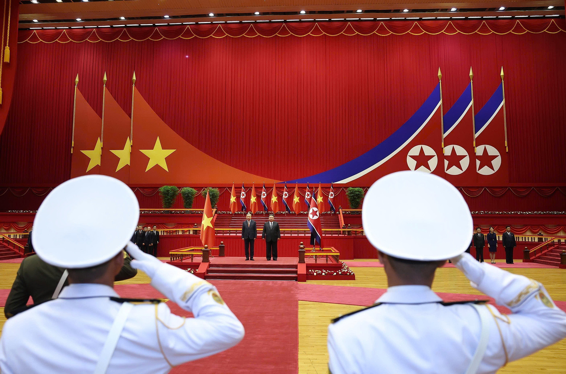 دبیر کل تو لام و دبیر کل و رئیس کمیسیون امور دولتی جمهوری دموکراتیک خلق کره، کیم جونگ اون، بر روی سکوی افتخار، در حال گوش دادن به گروه موسیقی نظامی که سرودهای ملی دو کشور را مینواختند. عکس: VNA