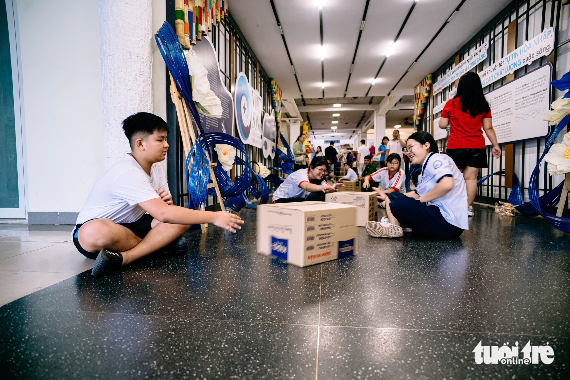 داوطلبان جوان یکدیگر را تشویق میکنند تا از کنار هر جعبهی امدادی عبور کنند - عکس: THANH HIEP