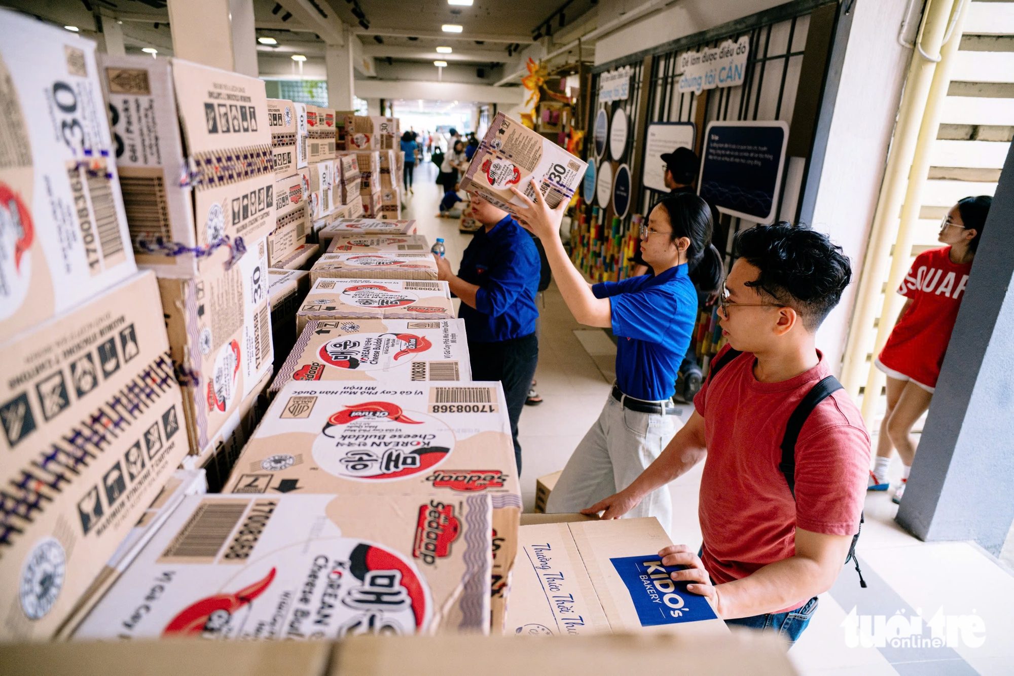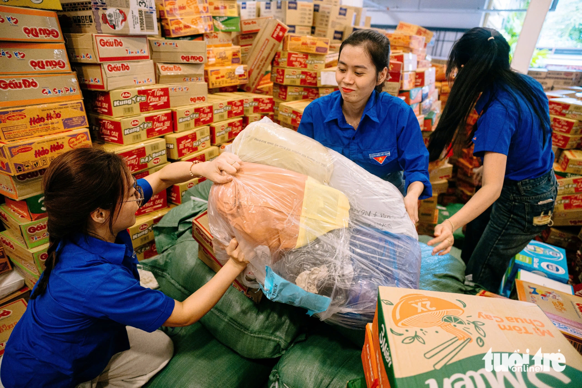 جوانان جعبههای کالاهای امدادی را مرتب روی هم چیده اند - عکس: THANH HIEP