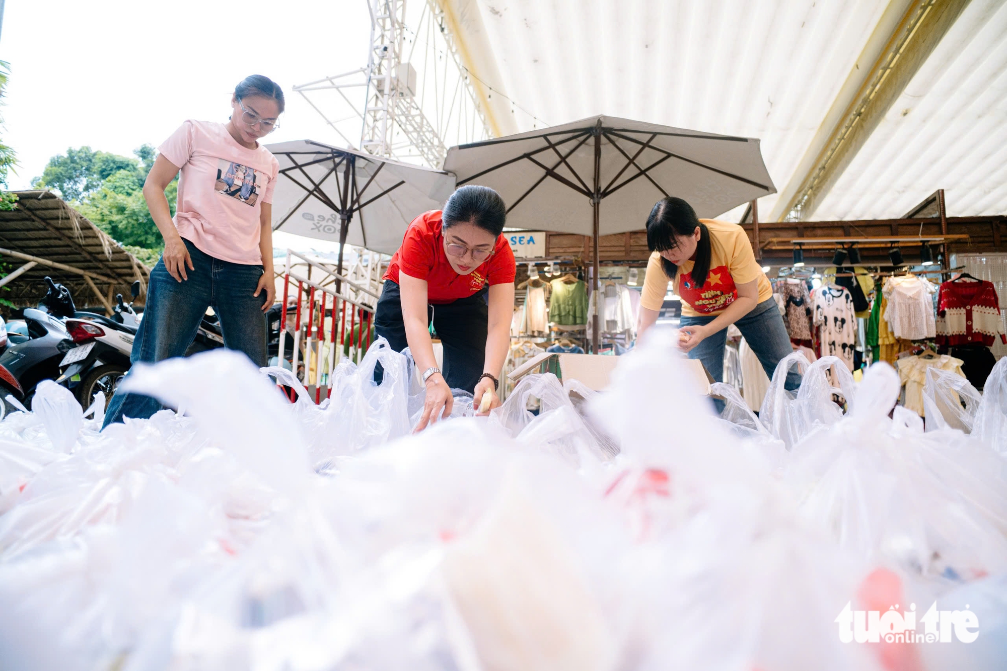 نگوین تی نگوک چائو، دختر شایسته ویتنام ۲۰۲۲ و اعضای تیم داوطلب هنرمند شهر هوشی مین مشغول تنظیم هر هدیه اهدایی هستند - عکس: THANH HIEP