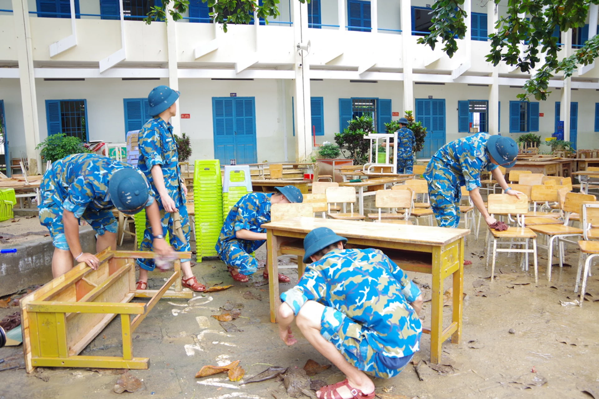 بر این اساس، از ۲۲ نوامبر، نزدیک به ۲۰۰ نفر از کادر، دانشآموزان، سربازان و بسیاری از وسایل نقلیه تخصصی مدرسه مانند بولدوزر، بیل مکانیکی، ماشینهای آتشنشانی، پمپهای فشار قوی، آمبولانس و ۵۰۰ وعده غذایی به مناطقی با خسارات سنگین از جمله: روستای فو آن نام (کمون دین خان)؛ مهدکودک گرین استار (منطقه شهری وین دیم ترونگ)؛ مدرسه ابتدایی نگوک هیپ و مدرسه متوسطه نگوک هیپ (بخش تای نها ترانگ) بسیج شدند. سربازان مدرسه با مقامات محلی برای پاکسازی گل و لای، تمیز کردن کلاسهای درس، پاکسازی سیستمهای زهکشی، پشتیبانی از جابجایی داراییها و ارائه مراقبتهای بهداشتی به مردم هماهنگی کردند.