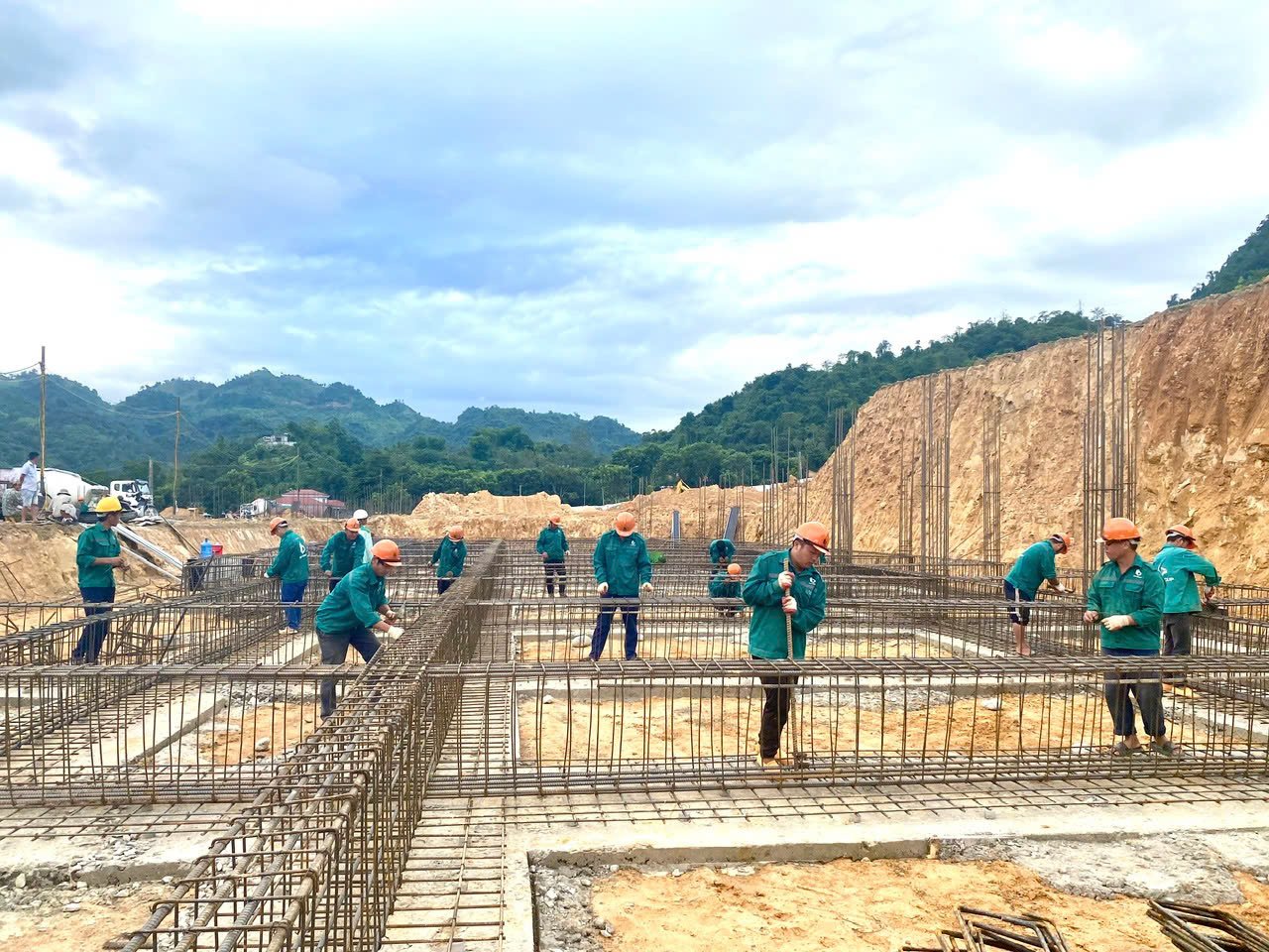 کارگران شرکت ساختمانی و تجاری شماره ۶ دین بین، در حال ساخت خانه شبانهروزی اولیه در پروژه مدرسه شبانهروزی ابتدایی و متوسطه فونگ تو هستند.