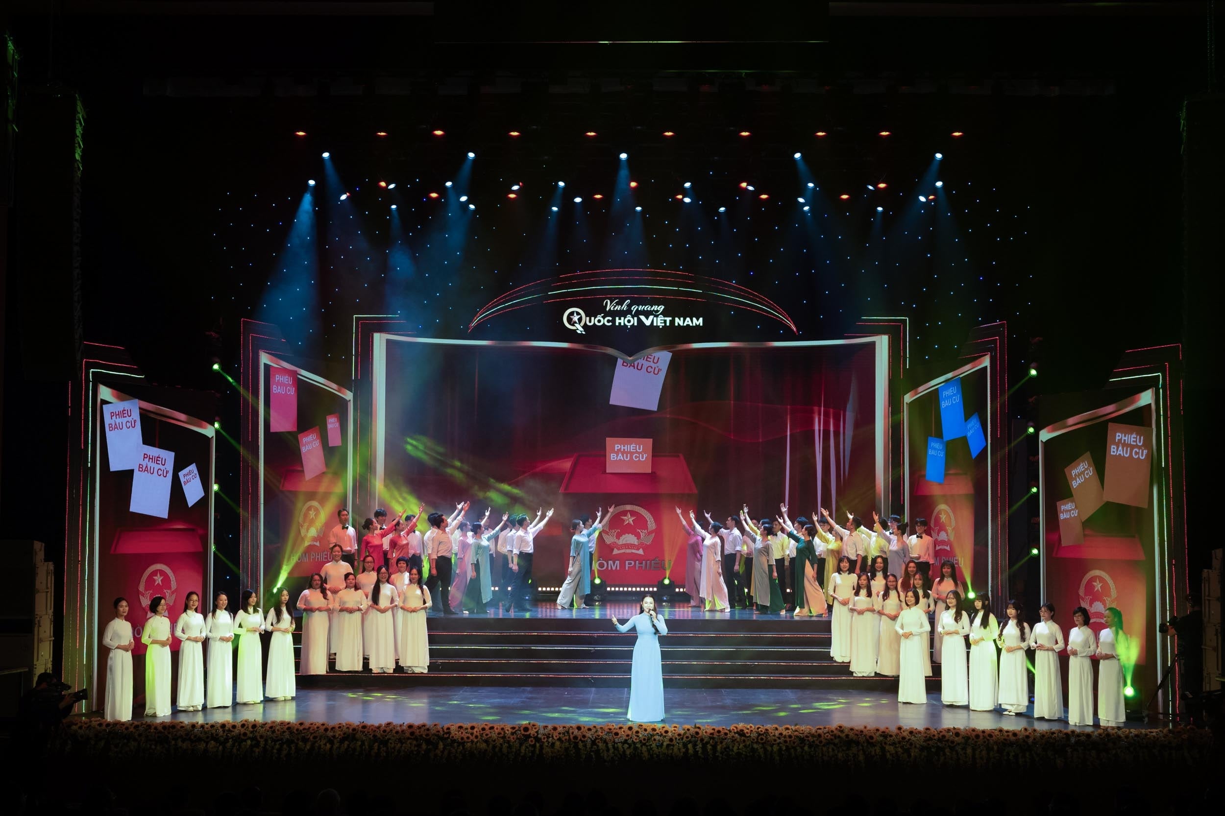 Le programme artistique et politique « Gloire de l’Assemblée nationale vietnamienne » est une épopée de foi, d’intelligence et d’aspiration, retraçant les 80 ans d’histoire de l’Assemblée nationale vietnamienne, depuis les premières élections générales jusqu’à sa contribution majeure à la révolution nationale et au développement du pays. De ces premières élections de 1946 – événement marquant un tournant décisif où le peuple vietnamien s’est exprimé pour la première fois aux urnes afin de décider du destin de la nation –, au cheminement de la résistance, de la construction nationale et de l’unification, en passant par l’innovation et l’intégration internationale, l’Assemblée nationale vietnamienne a progressivement mûri, devenant la plus haute instance du pouvoir d’État, porte-parole de la volonté et des aspirations du peuple.