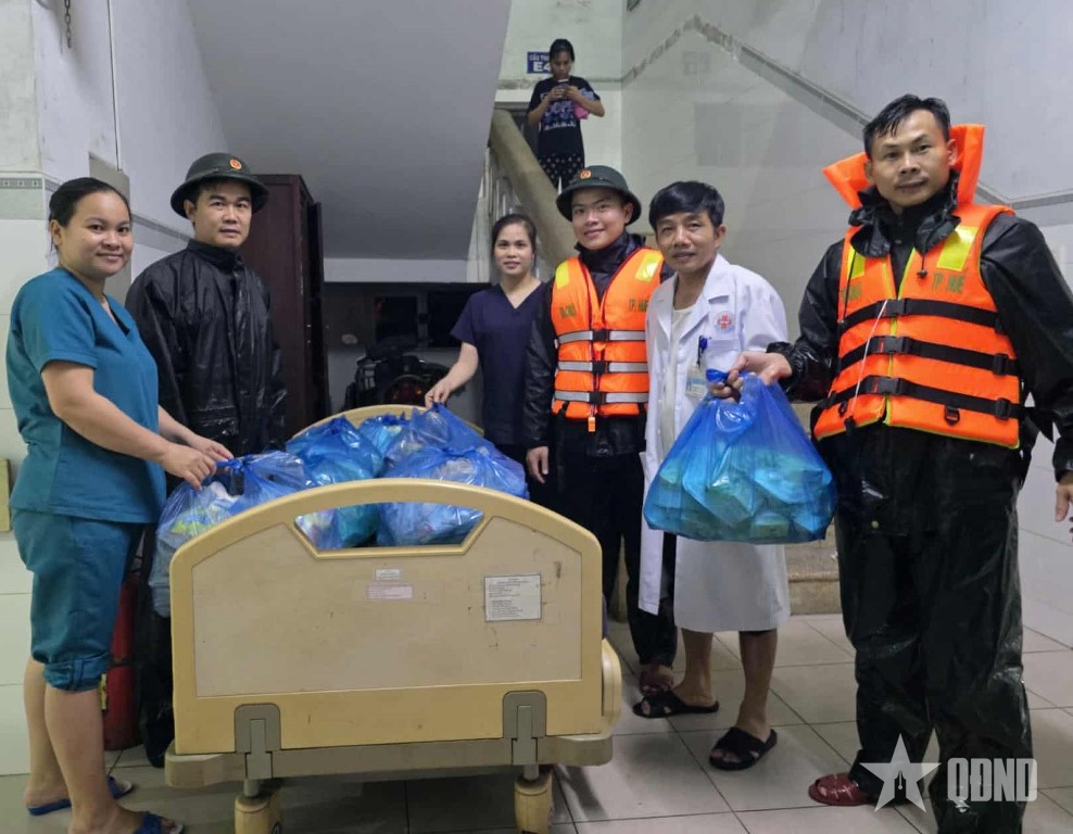 Dès réception de la nouvelle, l'unité a organisé une unité de ravitaillement placée sous le commandement direct du major Nguyen Tho, commissaire politique adjoint de l'unité, qui a immédiatement parcouru plus de 10 km à travers les eaux déchaînées, bravant tous les dangers, et est arrivée à l'hôpital cette nuit-là avec plus de 150 dons, dont du riz, des gâteaux, de l'eau minérale et d'autres produits de première nécessité pour les malades, afin de soutenir la population à temps.