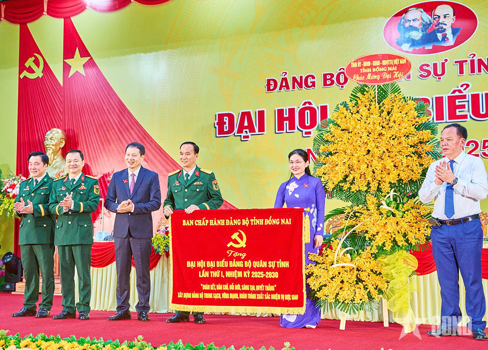 | Les dirigeants de la province de Dong Nai ont présenté une bannière au congrès du Parti militaire provincial de Dong Nai. Photo : THANH CHUNG |
