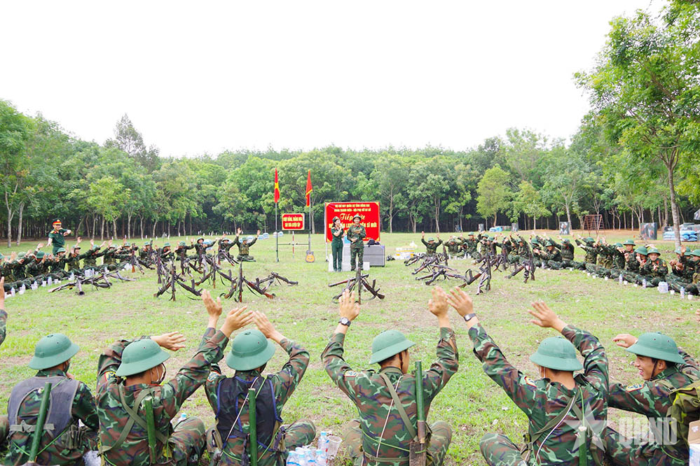 | Pause sur le terrain d'entraînement des officiers et soldats du commandement militaire provincial. Photo : THANH CHUNG |