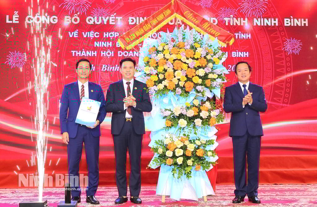 Lors de la cérémonie, le camarade Pham Quang Ngoc, secrétaire adjoint du Comité provincial du Parti et président du Comité populaire provincial, a présenté la décision de fusionner les Associations des jeunes entrepreneurs de Ninh Binh, Ha Nam et Nam Dinh (ancien), créant ainsi officiellement l'Association des jeunes entrepreneurs de la province de Ninh Binh. Le comité exécutif de l'Association a été présenté, témoignant de la détermination de l'association à bâtir une organisation unie, pionnière en matière d'innovation et créatrice de valeurs. M. Nguyen Duc Cuong a été nommé président de l'Association des jeunes entrepreneurs de la province de Ninh Binh pour le premier mandat après la fusion.