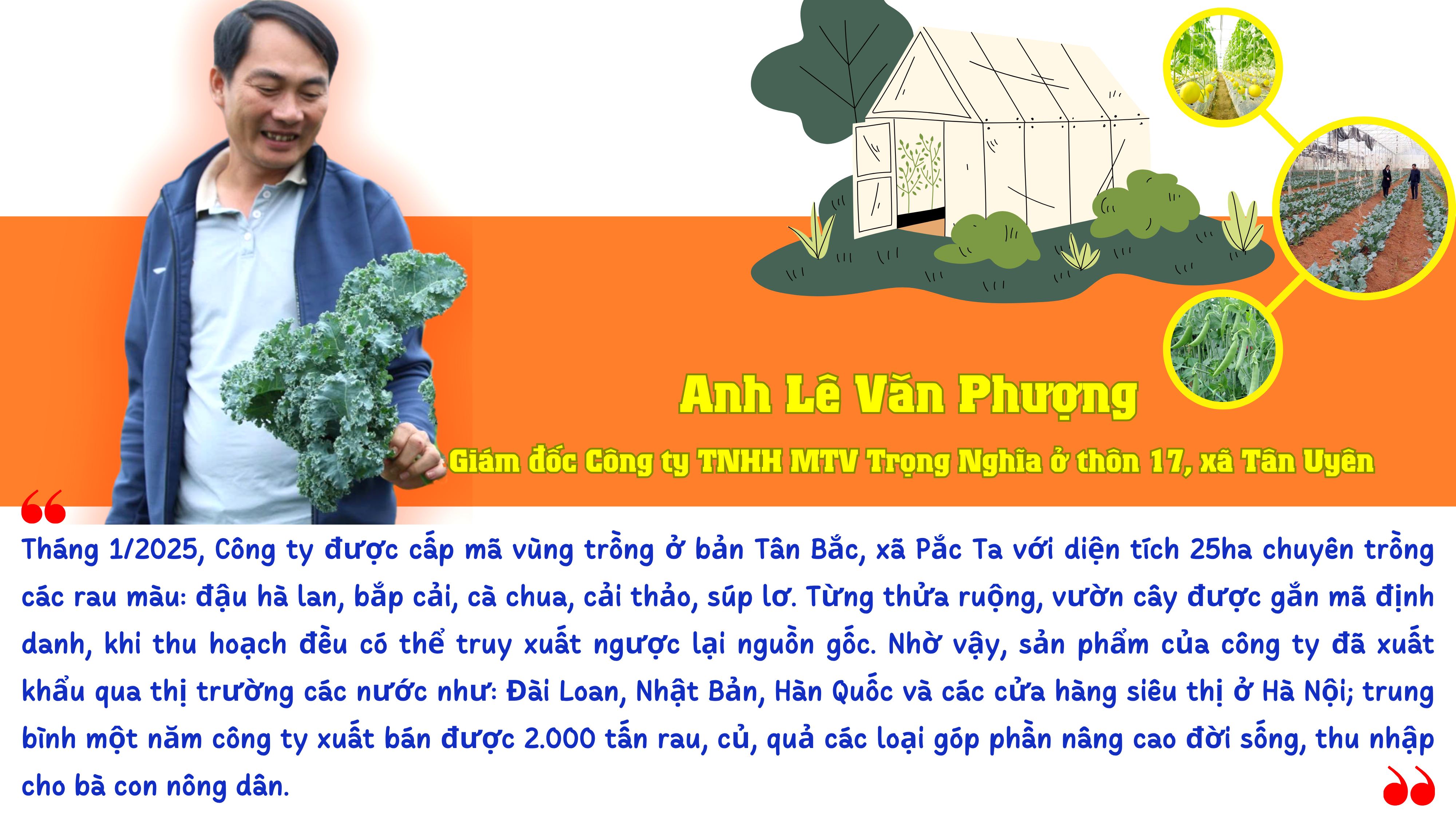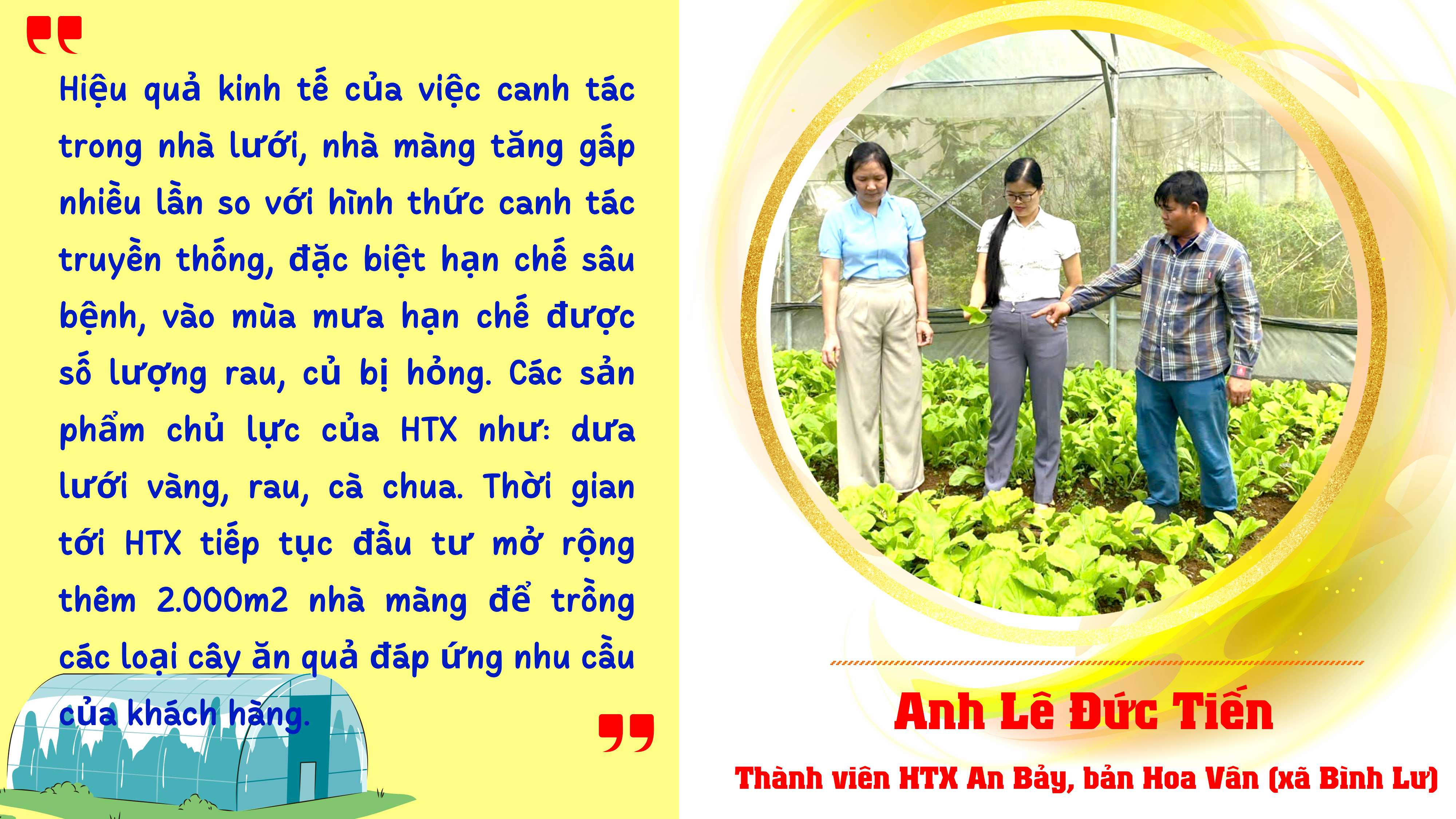 Après avoir étudié l'efficacité de l'application de hautes technologies aux serres et aux serres grillagées pour accroître la productivité, réduire l'utilisation d'engrais et ainsi augmenter les revenus de 35 à 40 % par rapport à la production traditionnelle, la coopérative An Bay, située dans le village de Hoa Van (commune de Binh Lu), est l'une des coopératives pionnières de la localité dans la conversion de terres agricoles inexploitées à la production sous serre de haute technologie. Avec une superficie de 9,7 hectares, la coopérative a réussi à mettre en place un modèle économique complet, notamment la culture d'arbres fruitiers, de gingembre et de manioc. 1 000 mètres carrés sont investis dans des serres pour la culture de légumes, de tubercules et de fruits spécialisés. Grâce à cela, la productivité et le rendement ont augmenté par rapport à l'agriculture traditionnelle. Après déduction des charges, la coopérative réalise un chiffre d'affaires annuel de plus de 300 millions de VND.