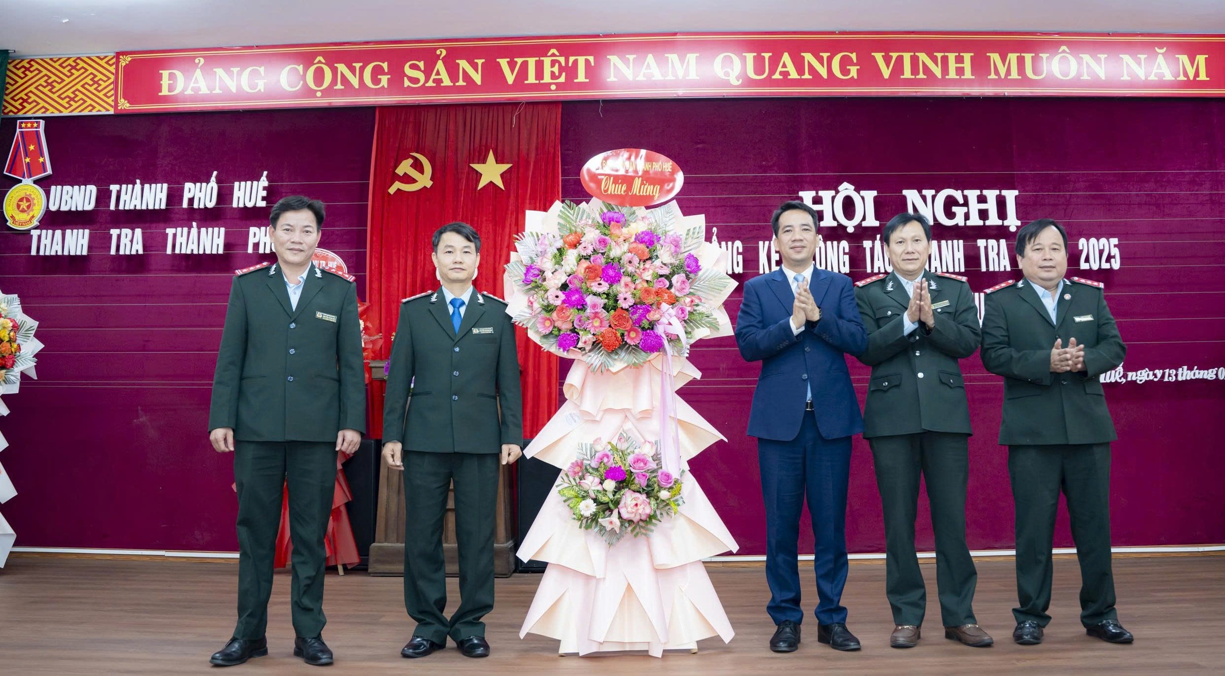 | La vice-présidente du Comité populaire de la ville, Tran Huu Thuy Giang, offre des fleurs à l'Inspection municipale. |