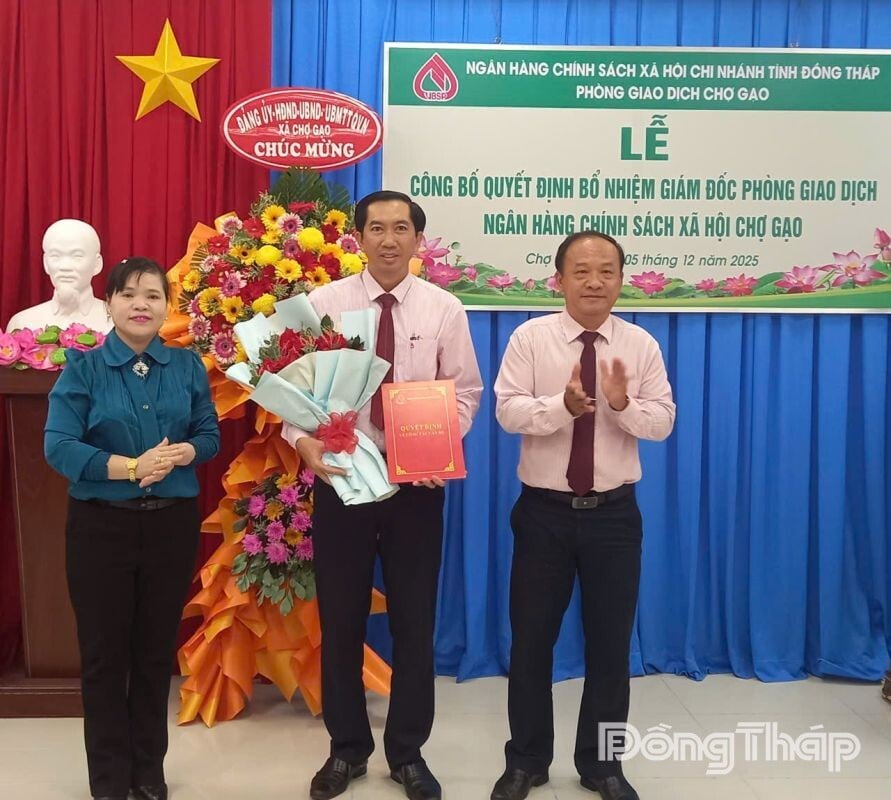 Lors de la cérémonie, M. Duong Van Hoang, directeur de la succursale provinciale de la Banque de politique sociale, a remis la décision de transférer et de nommer M. Nguyen Quoc Tinh, directeur du bureau des transactions de la Banque de politique sociale de Cai Lay, au poste de directeur du bureau des transactions de la Banque de politique sociale de Cho Gao à compter du 1er décembre 2025.