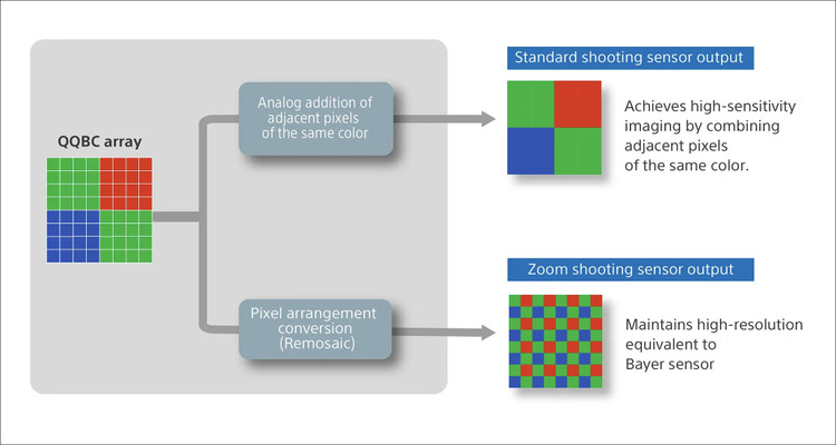 Chaque pixel mesure 0,7 micromètre, une caractéristique similaire à celle des capteurs 200 MP actuels. Sony utilise une structure Quad Bayer qui étend la matrice de pixels et le traitement rémosaïque grâce à un matériel dédié, ce qui permet de reproduire des couleurs fidèles et de minimiser le bruit lors de la conversion des données.