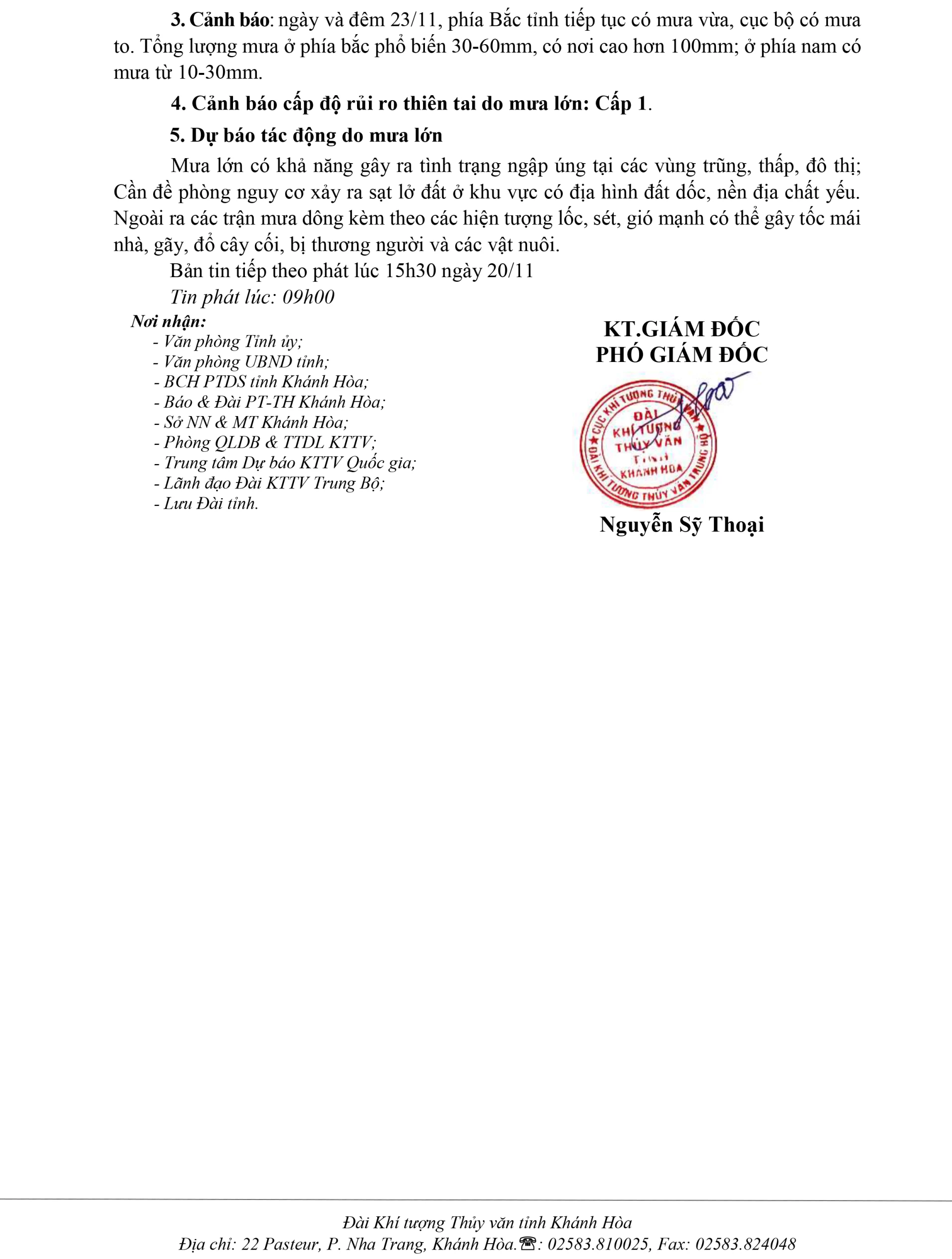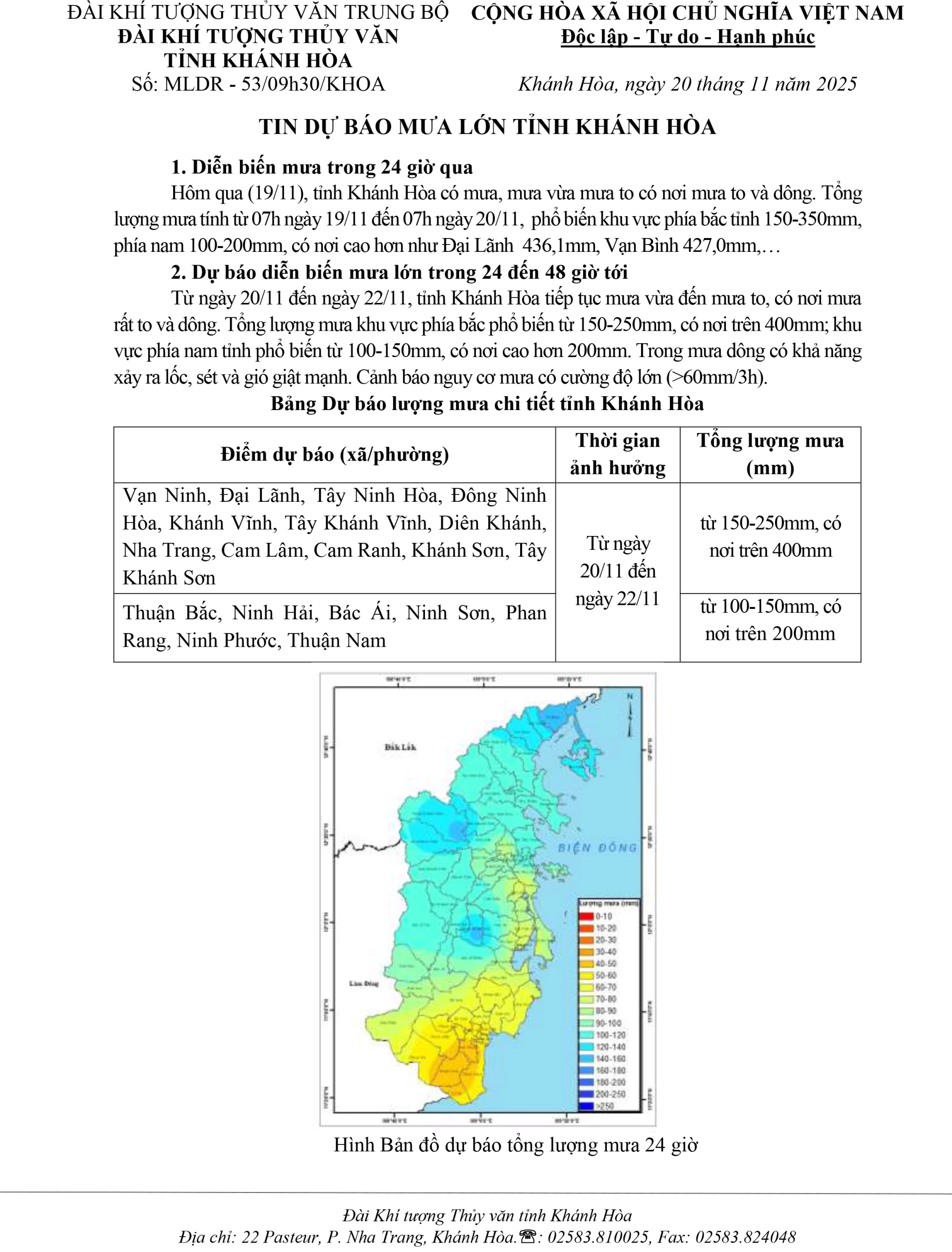 Alerte aux crues soudaines, glissements de terrain, affaissements de terrain ou débordements d'eau dans la province de Khanh Hoa (actualités à 11h30 le 20 novembre)