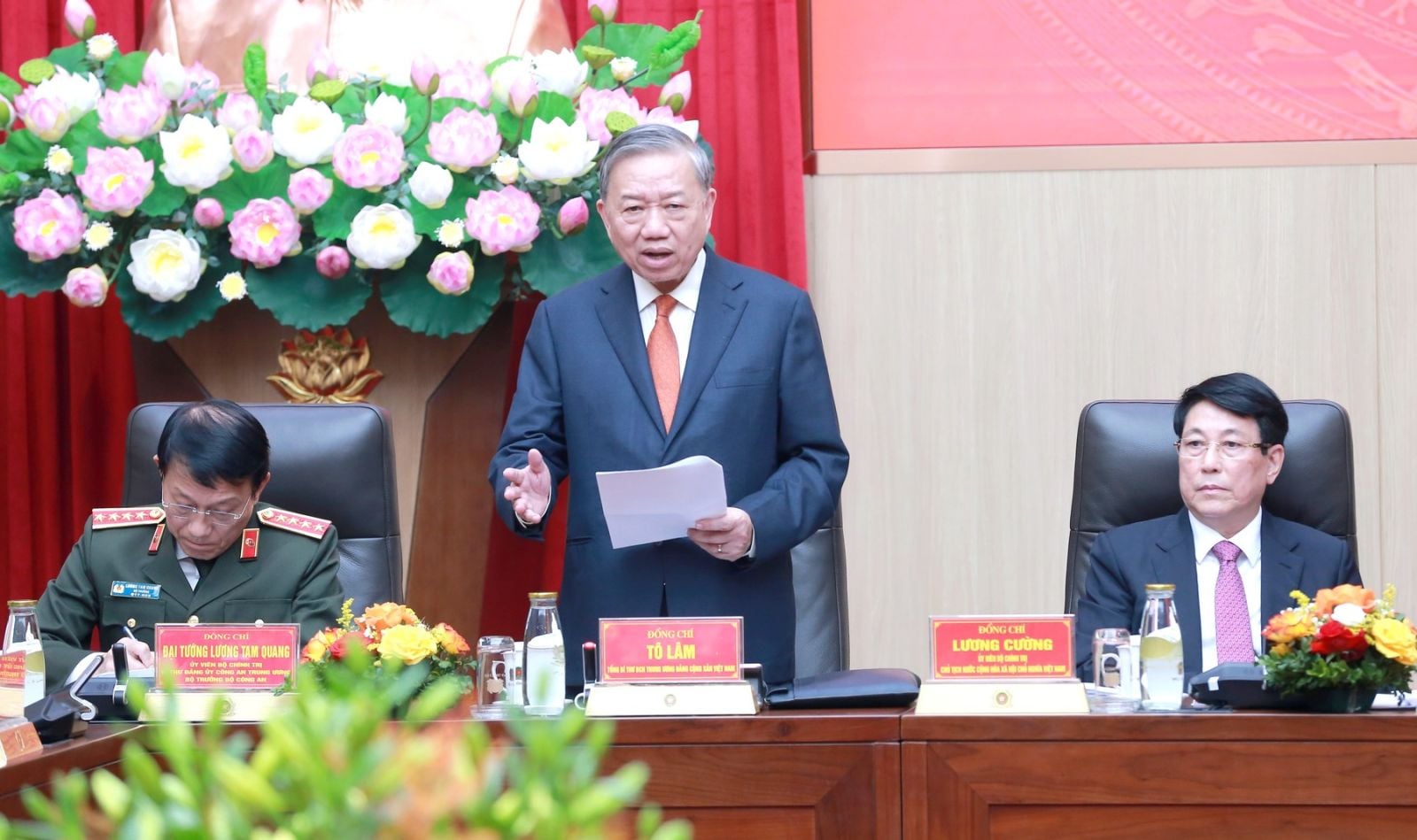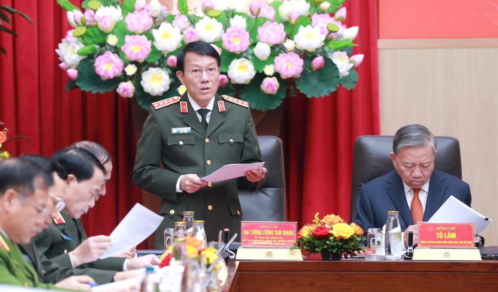 Du côté du Comité central du Parti de la sécurité publique, se trouvaient des camarades : le général Luong Tam Quang, membre du Politburo, secrétaire du Comité central du Parti de la sécurité publique, ministre de la Sécurité publique et président de la Conférence ; des camarades du Comité central du Parti de la sécurité publique, des dirigeants du ministère de la Sécurité publique…