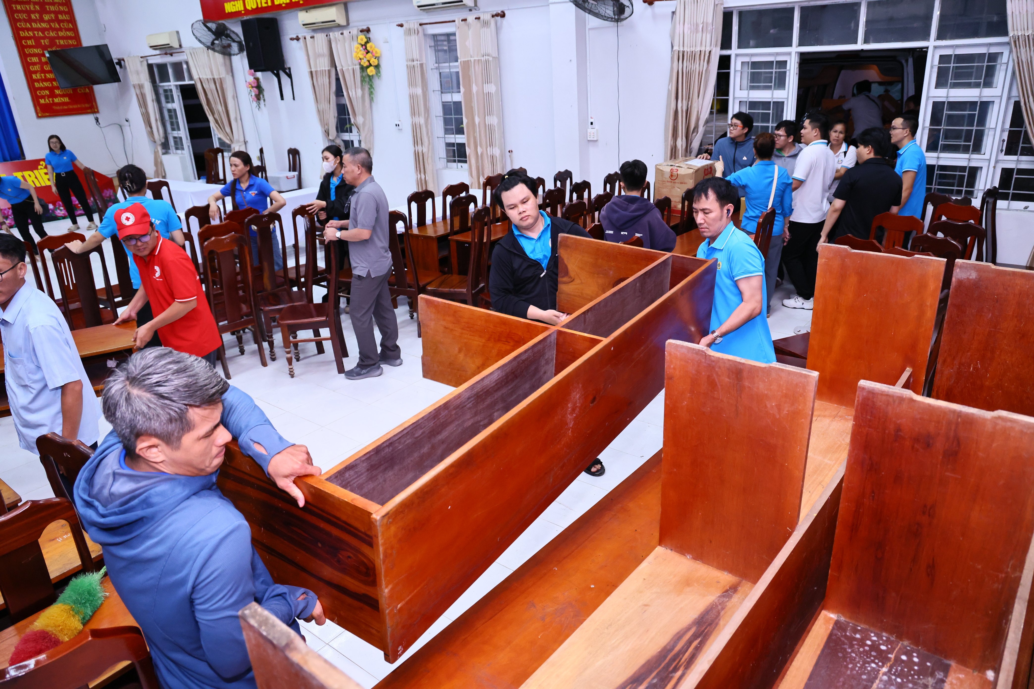 Le groupe de travail n° 5 de la province de Dong Nai, dirigé directement par la directrice du département de la Santé, Do Thi Nguyen, et composé de 25 membres (médecins, personnel médical des hôpitaux généraux de Dong Nai et de Thong Nhat, ainsi que personnel, enseignants et étudiants de la faculté de médecine de Dong Nai), s'est rendu à la salle centrale de la commune de Son Thanh Dong, dans la province de Dak Lak, à la nuit tombée. Heureusement, les eaux s'étaient retirées, rendant le lieu propre et sûr.