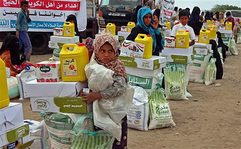 Người dân nhận hàng cứu trợ ở Hays, tỉnh Hodeida, miền Tây Yemen. Ảnh: AFP