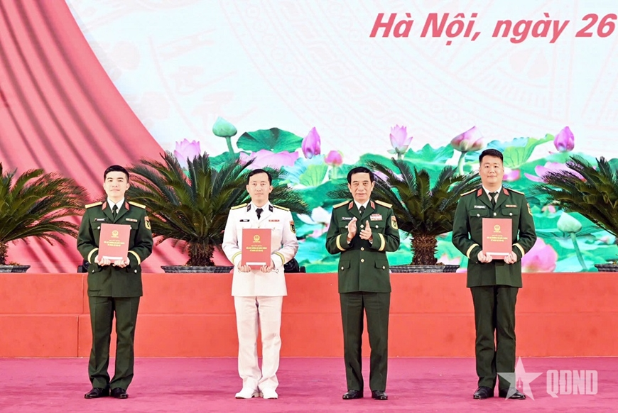 | הגנרל פאן ואן ג'יאנג, חבר הפוליטביורו, סגן מזכיר הוועדה הצבאית המרכזית, שר ההגנה הלאומית, הציג החלטות בנוגע לגיוס קאדרים, הענקת דרגות קצינים, קידום דרגות קצינים מוקדם מהמתוכנן והעלאת משכורות מוקדם מהמתוכנן לפנים הצעירות המצטיינות של הצבא כולו בשנת 2024. צילום: וייט טרונג |