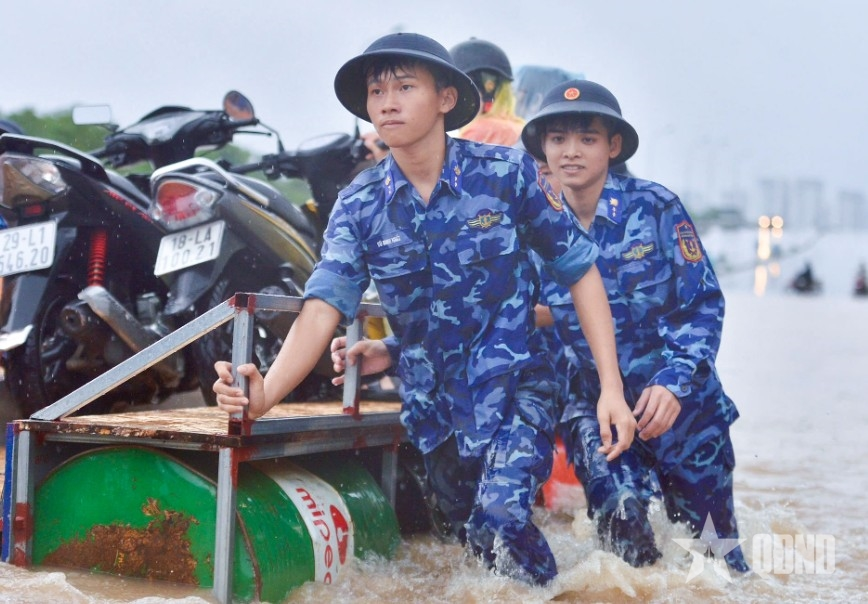 | קציני וחיילים של משמר החופים מסייעים לתושבי האנוי להימלט מאזורים מוצפים עמוק בכביש לאומי 70. צילום: DUC TINH |