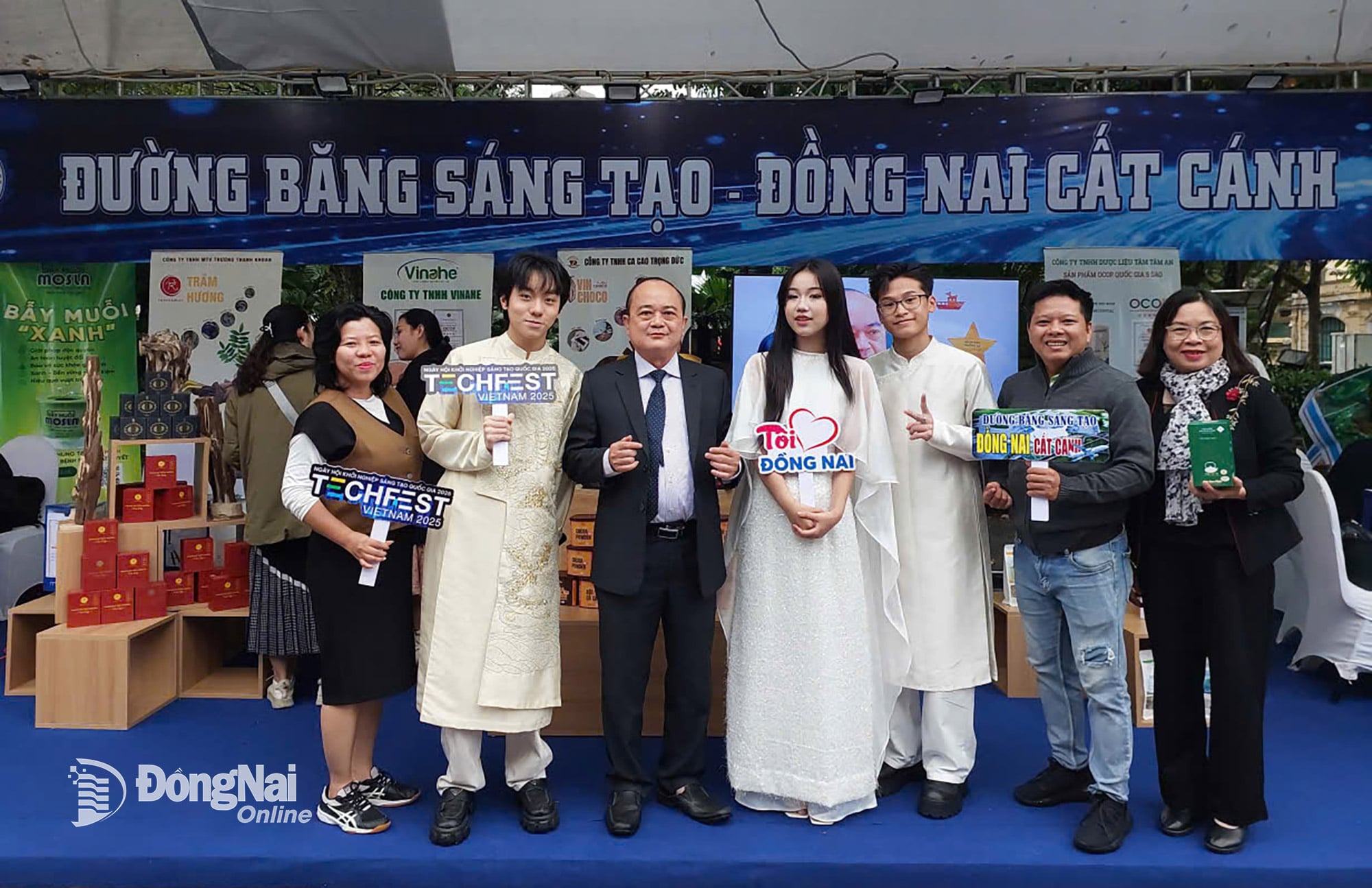 | מנהיגי מחלקת המדע והטכנולוגיה של מחוז דונג נאי מצטלמים עם צעירים בדוכן המציג מוצרים אופייניים, מוצרי סטארט-אפ וחידושים של מחוז דונג נאי בכנס Techfest Vietnam 2025. צילום: תורם. |