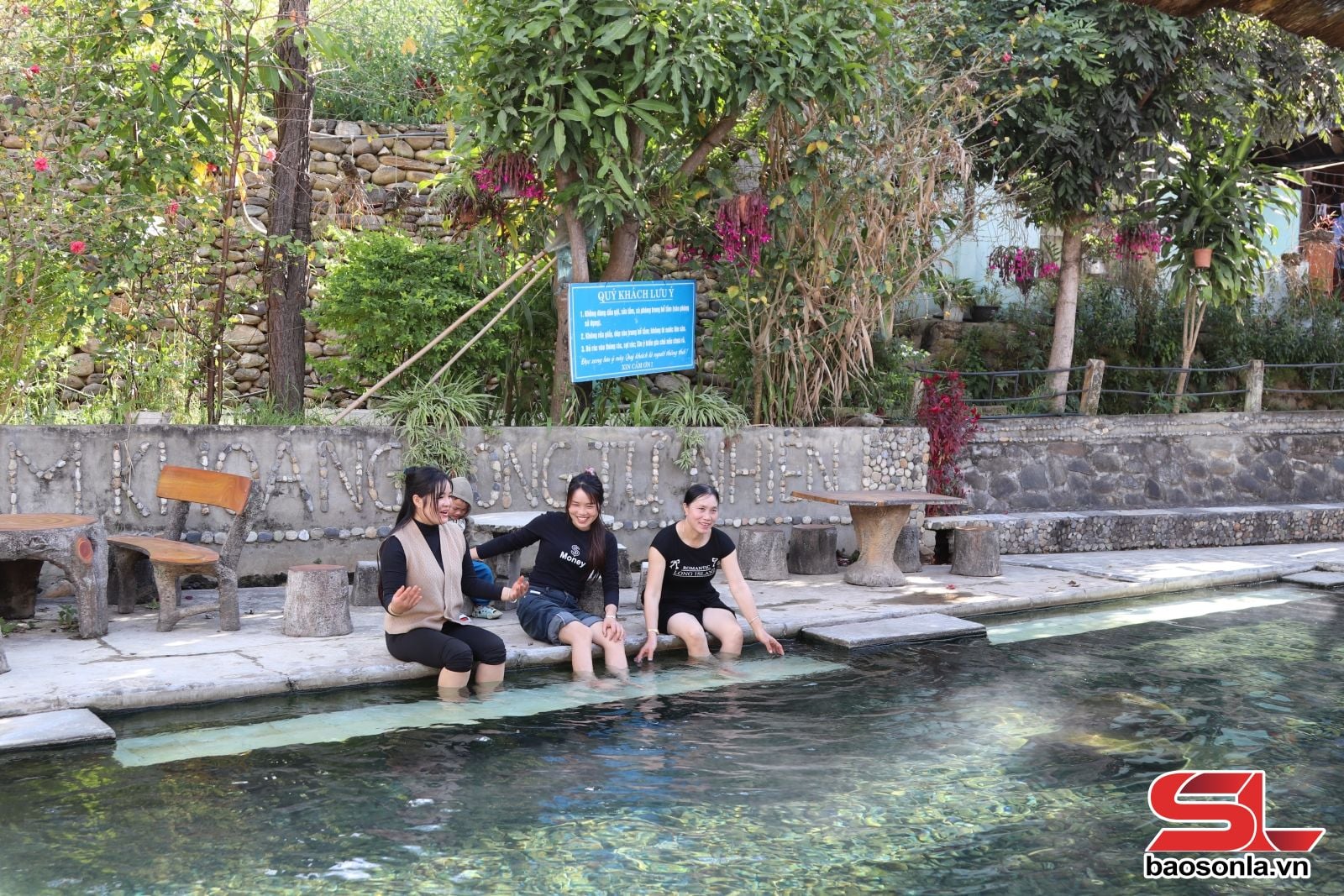 תיירים חווים את המעיינות החמים ב-Bản Lướt, קומונה Ngọc Chiến.