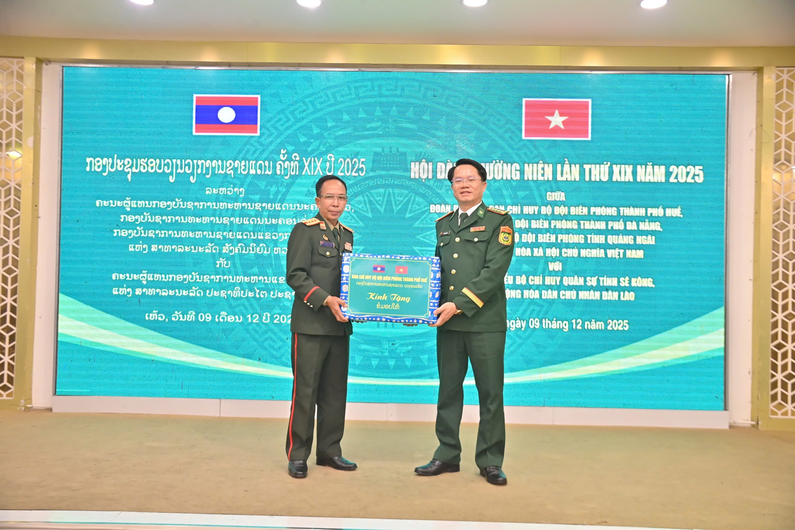 | קולונל דאנג נגוק הייאו, מזכיר המפלגה והקומיסר הפוליטי של משמר הגבול של העיר הואה (מימין), מעניק מתנות לצד השני. |