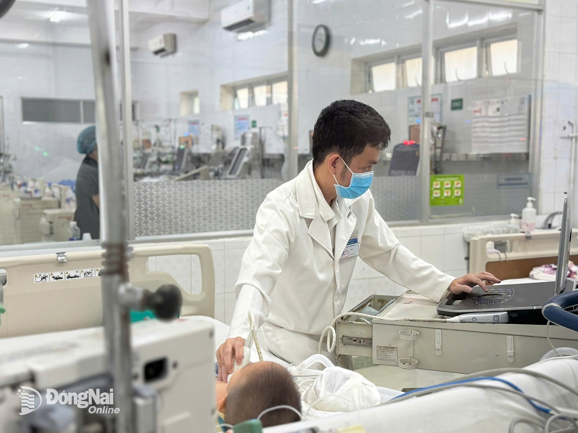 | डॉक्टर शिशु एचएमडी का अल्ट्रासाउंड कर रहे हैं, जो हाथ, पैर और मुंह की गंभीर बीमारी के कारण वेंटिलेटर पर है। फोटो: बिच न्हान |