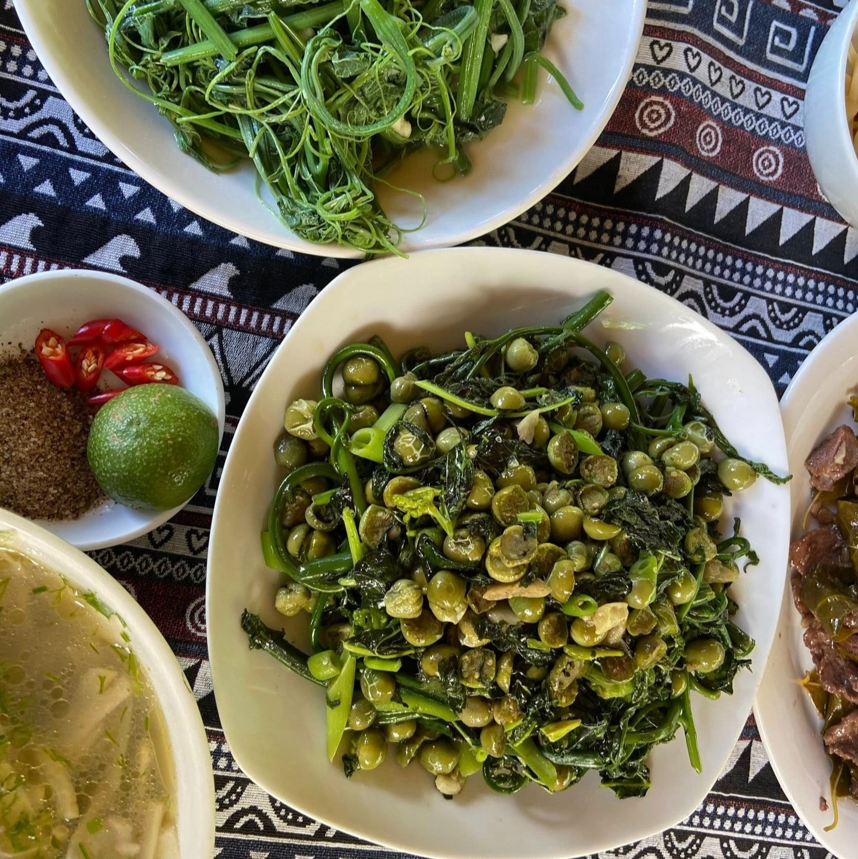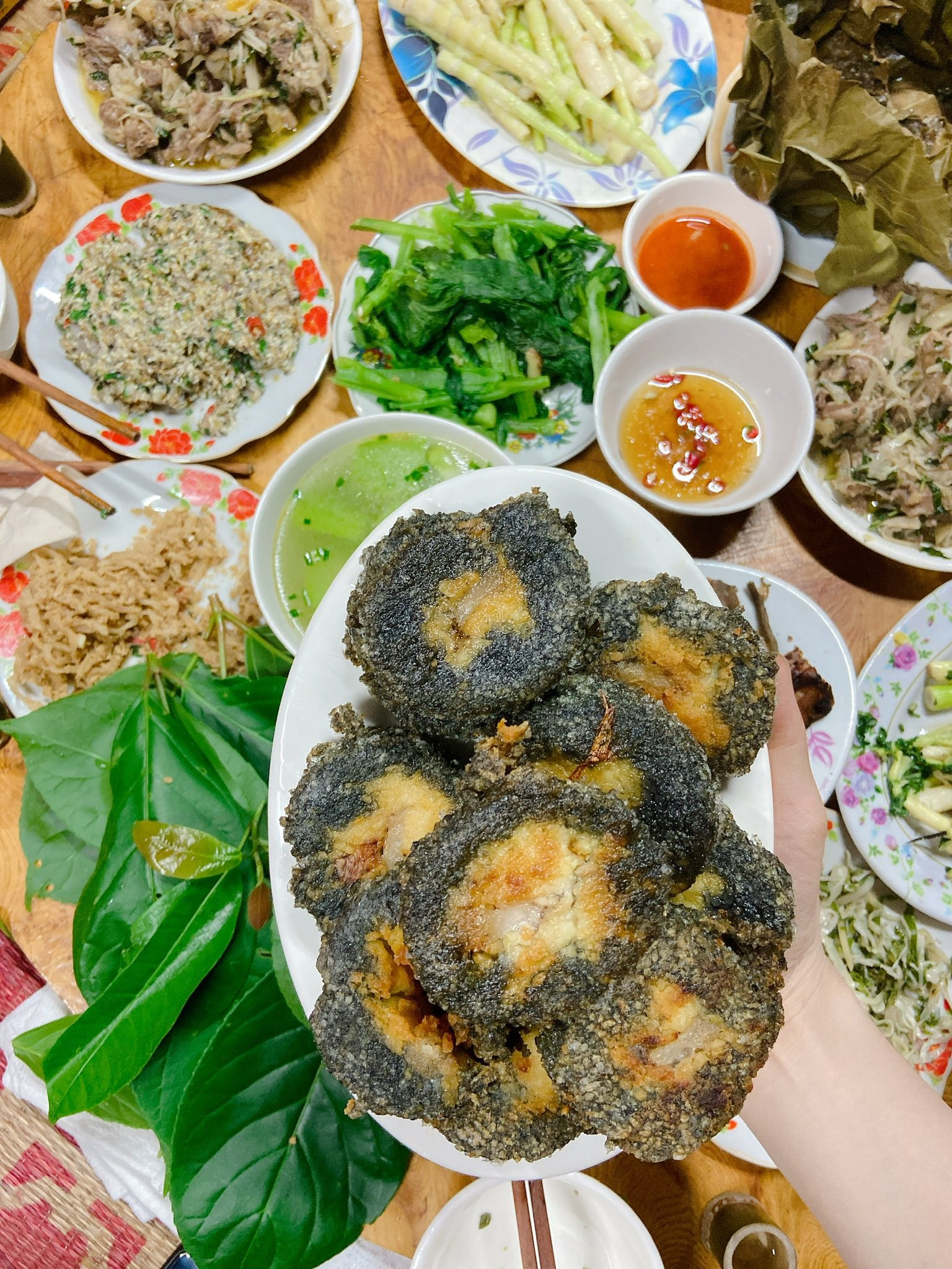 खास तौर पर, उन्हें खाने को पत्तों (केले के पत्ते, डोंग के पत्ते, अंजीर/नगोआ के पत्ते) में लपेटकर फिर ग्रिल, स्टीम या चिपचिपे चावल पकाने की आदत होती है। इससे खाने में नमी बनी रहती है, उसमें जंगल के पत्तों की खुशबू आती है, और वह स्वादिष्ट और स्वास्थ्यवर्धक दोनों होता है।