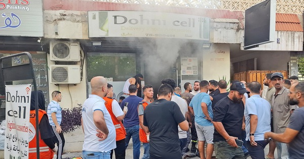 18 सितम्बर को लेबनान के सिडोन में धुएं से घिरे एक मोबाइल फोन स्टोर के सामने लोग इकट्ठा हुए।