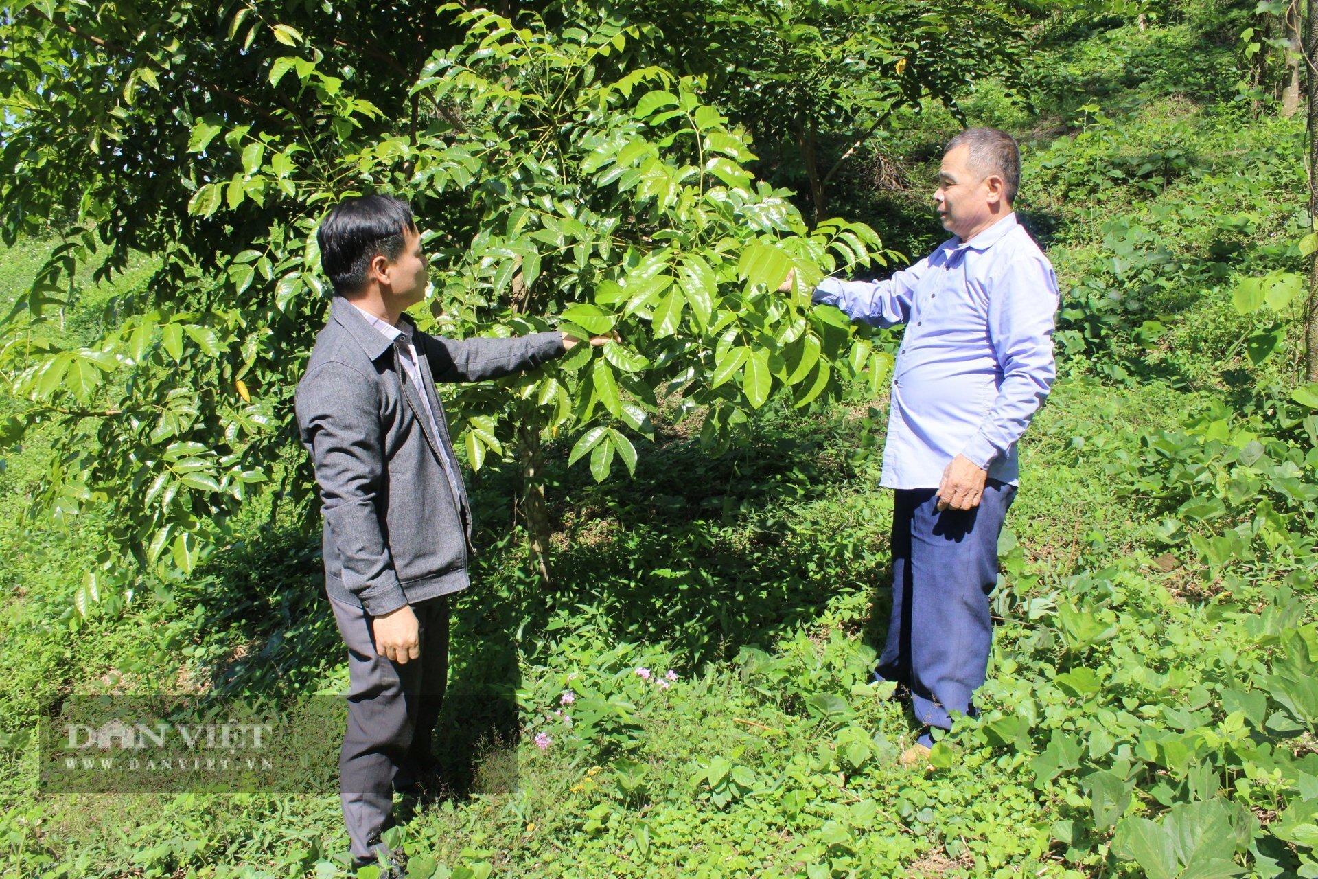 श्री गियांग (तस्वीर के दाईं ओर) खान खे कम्यून के अधिकारियों के साथ ग्राफ्टेड ब्लैक कैनारियम गार्डन के विकास के बारे में जानकारी साझा करते हुए। फोटो: होआंग तिन्ह