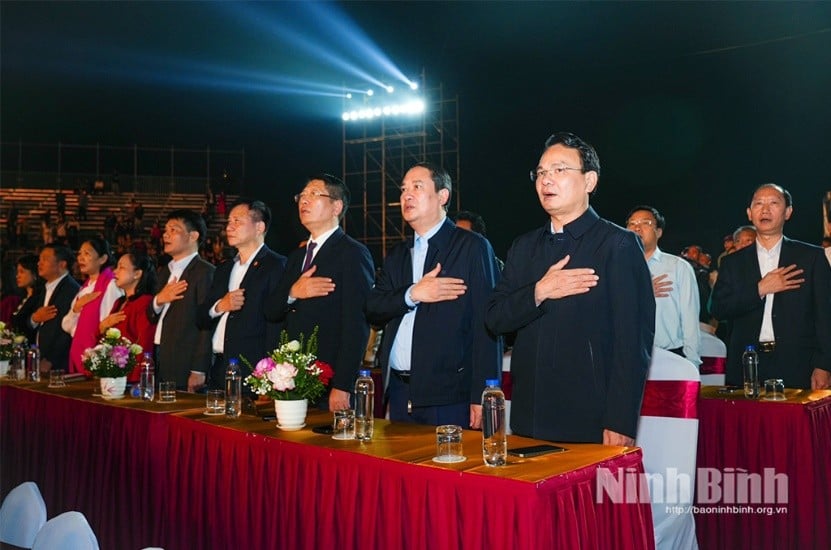 कार्यक्रम में उपस्थित प्रतिनिधियों ने वियतनाम समाजवादी गणराज्य का राष्ट्रगान "तिएन क्वान का" गीत एक साथ गाया। चित्र: निन्ह बिन्ह समाचार पत्र और रेडियो एवं टेलीविजन