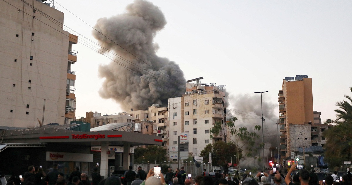 14 नवंबर को लेबनान के बेरूत के बाहरी इलाके में एक इमारत से धुआं उठते हुए लोग।