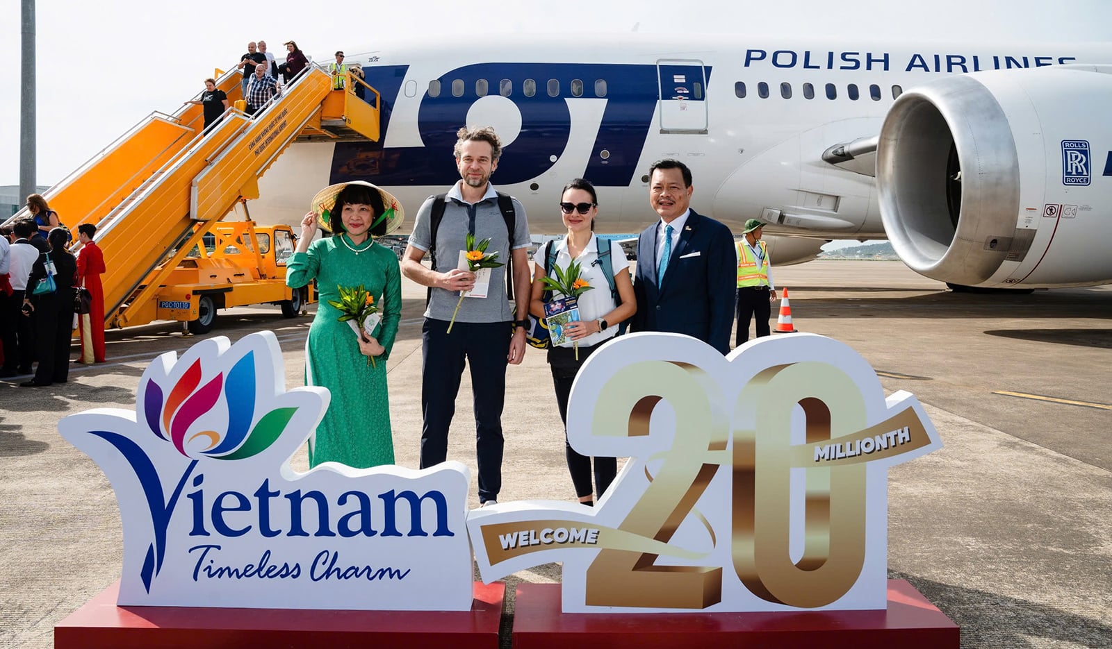 स्वागत समारोह को गरिमापूर्ण ढंग से आयोजित किया गया, जिसमें विमान पर प्रतिनिधिमंडल का स्वागत करने के लिए अनुष्ठान किए गए, फूल भेंट किए गए, पारंपरिक कला का प्रदर्शन किया गया, और तीन विशेष अतिथियों - 19,999,999वें, 20,000,000वें और 20,000,001वें अतिथियों - को प्रमाण पत्र और स्मृति चिन्ह प्रदान किए गए। यह आयोजन सन ग्रुप और न्गोक हिएन पर्ल के प्रायोजन से आयोजित किया गया था।