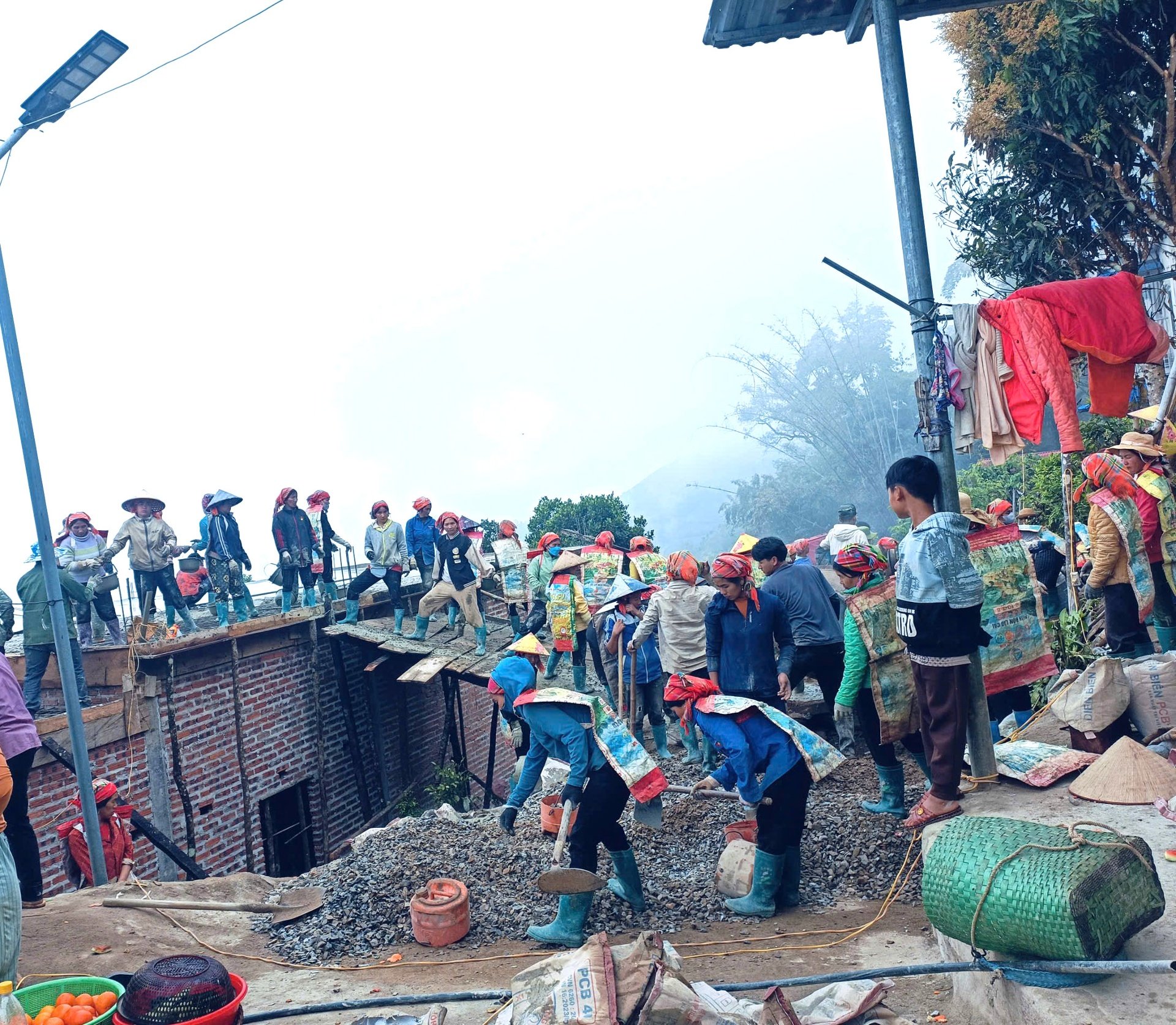 थू लुम कम्यून की महिला संघ की सदस्याएं एक दूसरे को घर बनाने में मदद करती हैं।