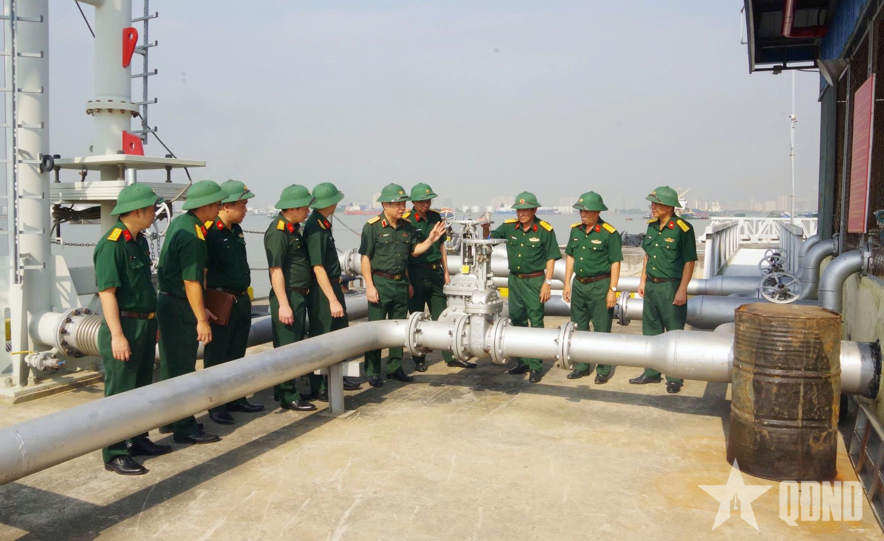 Lãnh đạo Cục Xăng dầu (Tổng cục Hậu cần-Kỹ thuật) kiểm tra hệ thống tiếp nhận, cấp phát nhiên liệu tại Phân kho 101, Kho 186. Ảnh: NGUYỄN HẢI |