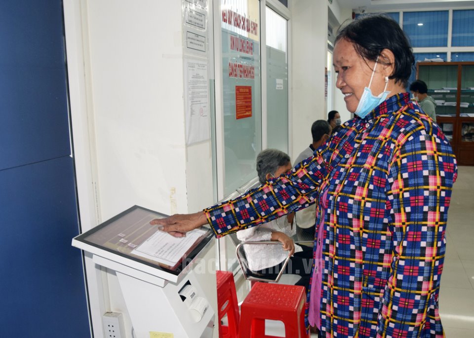 Bà Trương Thị Hồng, ngụ Khóm 2, Phường 8 bấm số chờ giao dịch hồ sơ đất tại Trung tâm Hành chính công TPTV.