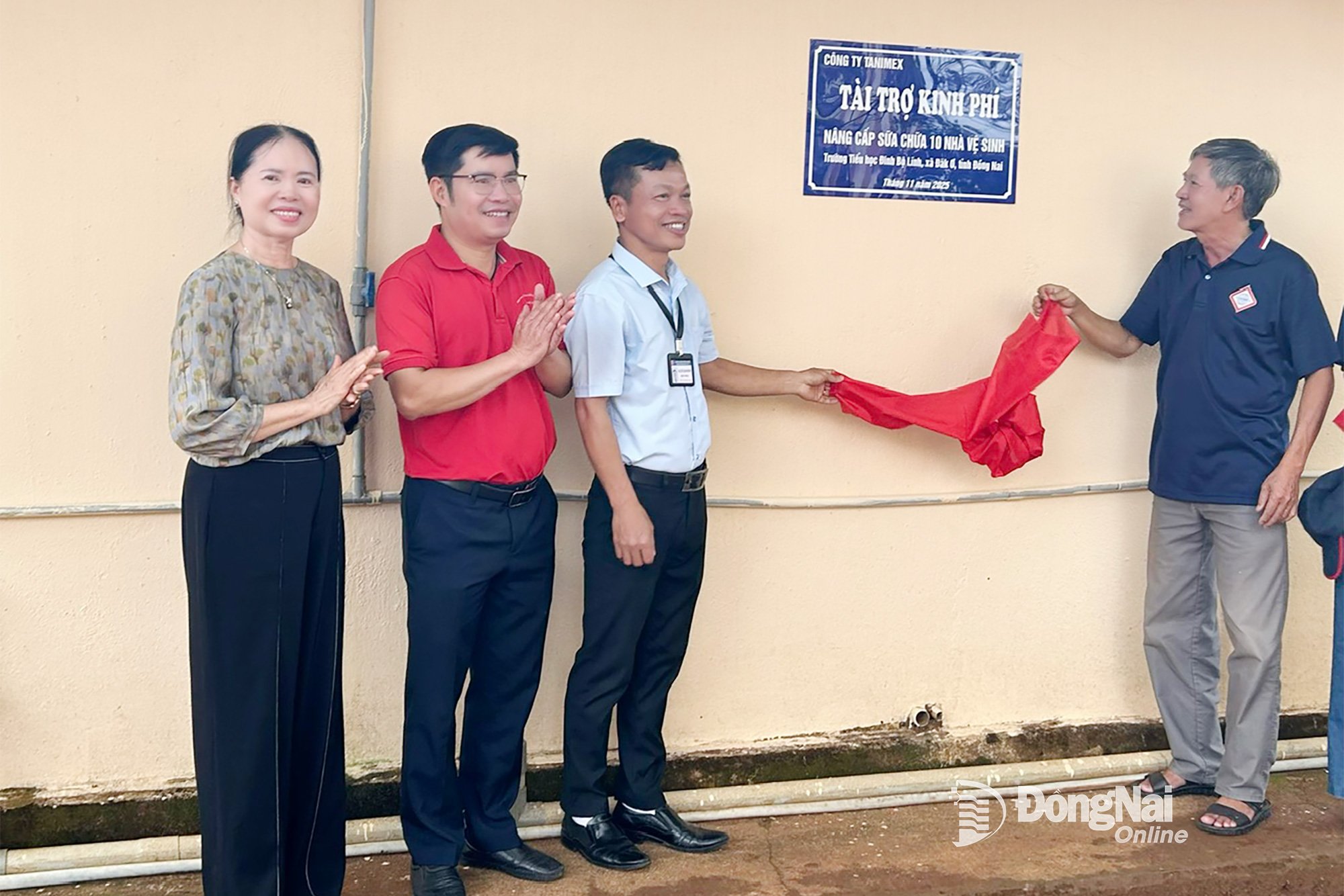 | Thực hiện nghi thức khai trương công trình sửa chữa 10 phòng vệ sinh tại Trường tiểu học Đinh Bộ Lĩnh (xã Đak Ơ). Ảnh: L.T |