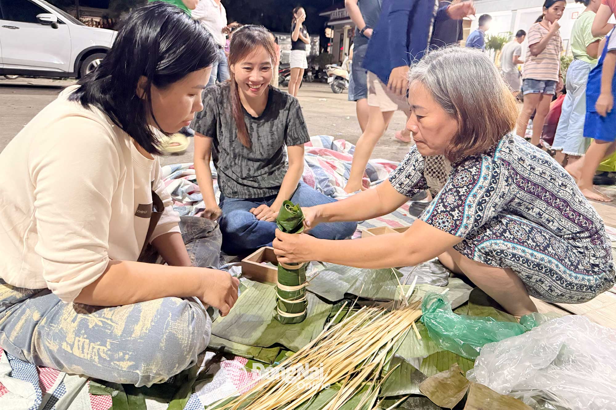 | A Dong Nai tartománybeli Trang Dai kerületben a nők megtanítják egymásnak, hogyan kell becsomagolni a banh tetet, hogy több banh tetjük legyen, amit elküldhetnek az emberek támogatására. Fotó: Cong Nghia |