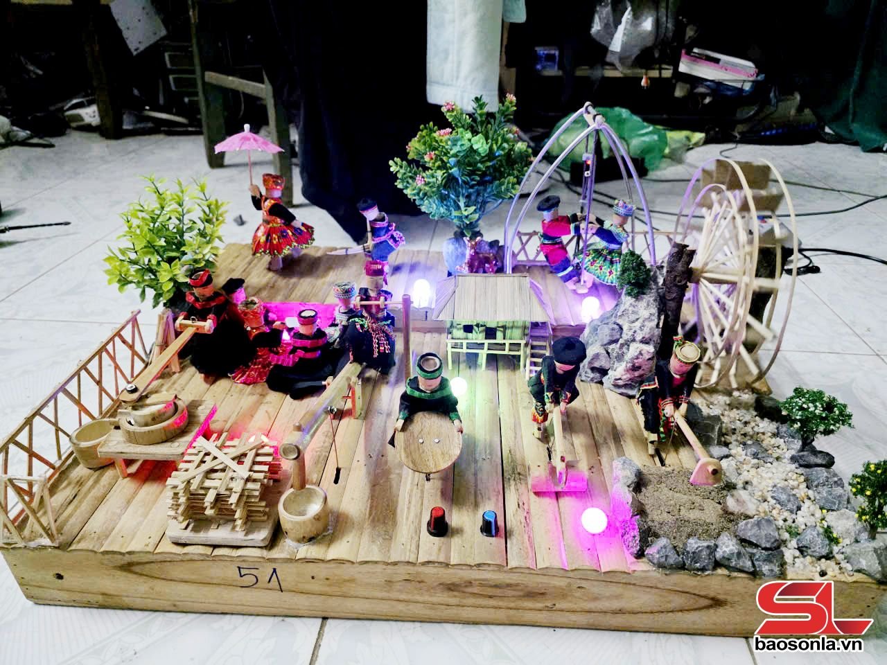 A modell dinamikus modellként készült, amely egy kis motornak és újrahasznosított elemeknek köszönhetően mozog. Bekapcsoláskor a színes népviseletbe öltözött babák táncolni fognak, rizst zúznak, lisztet őrölnek, hintáznak, miközben egy régi játékokból származó hangmodulból könnyű zene szól. Mindez élénk miniatűr képet fest a felföld egyszerű és pezsgő életéről.