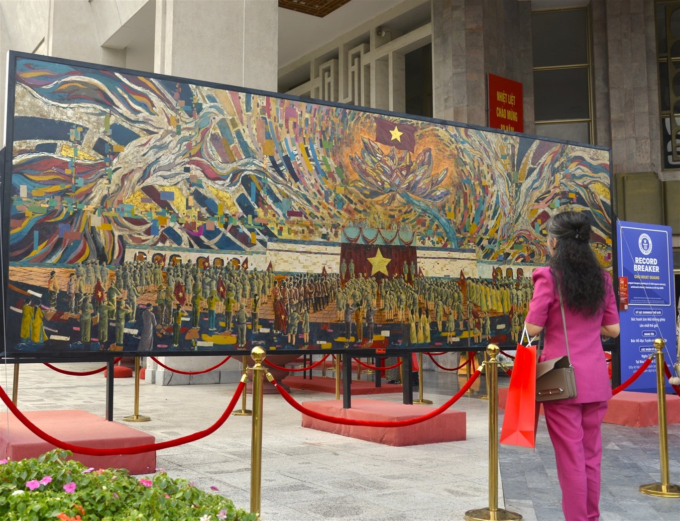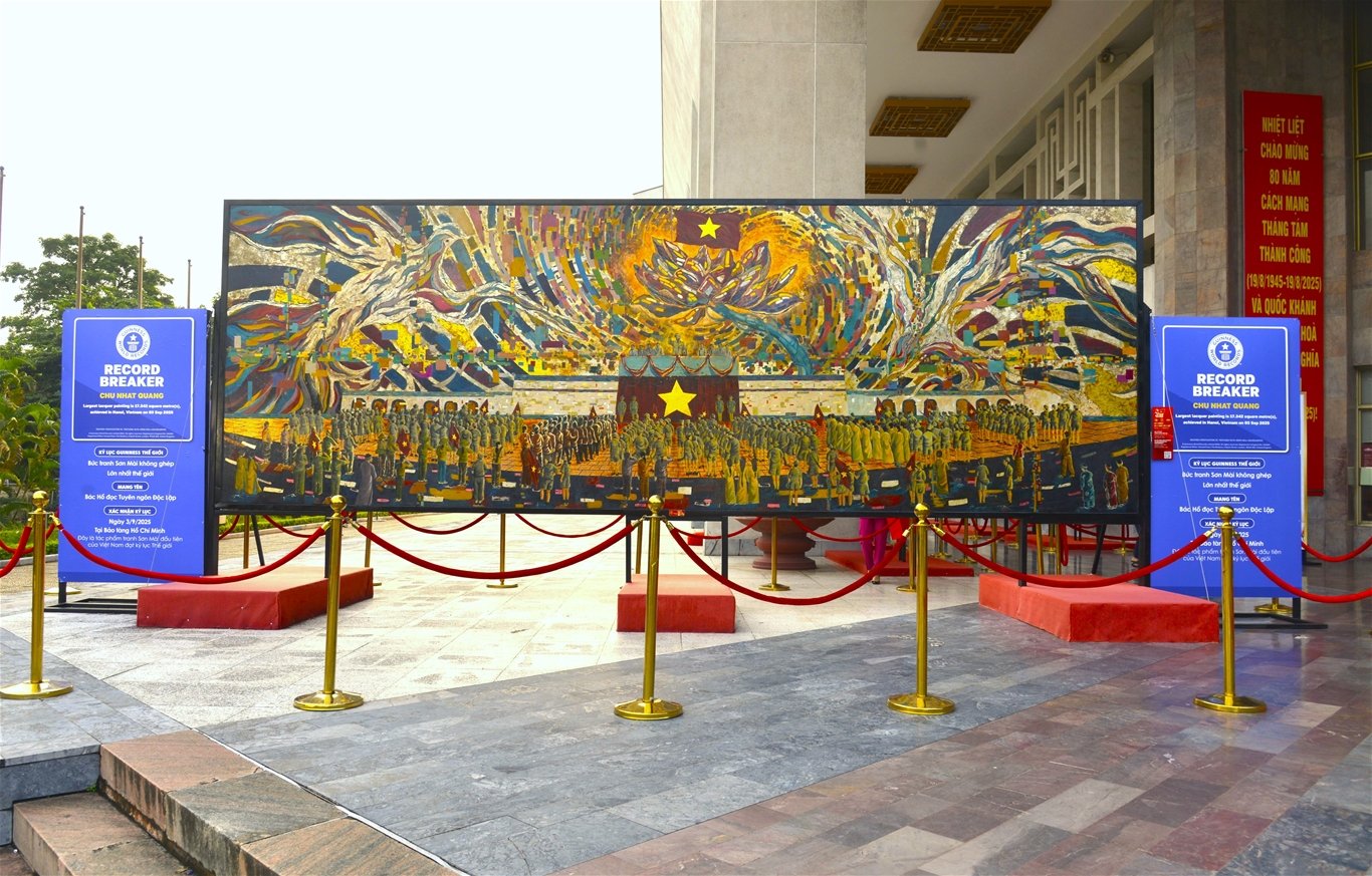 Panorámakép a Guinness- rekordok átvételi ünnepségéről, ahol Chu Nhat Quang művész legnagyobb monolit lakkfestményét, a „Ho bácsi felolvassa a Függetlenségi Nyilatkozatot” mutatták be. Fotó: BTHCM.