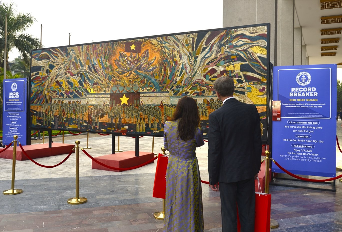 Chu Nhat Quang művész „Ho bácsi felolvassa a Függetlenségi Nyilatkozatot” című lakkfestménye 2,4 m x 7,2 m méretű, 3 tonnát nyom, kétoldalas lakkpanelre készült, összeszereletlenül – ez a technika ügyes kézműves munkát és kreativitást igényel. A mű első oldala