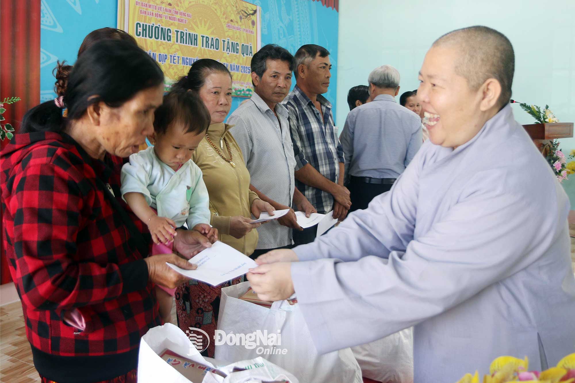 | Dieu Tri buddhista apáca, a vietnami buddhista szangha végrehajtó bizottságának helyettes vezetője, a Dai Giac pagoda (Tran Bien körzet) apátja ajándékokat ad át nehéz helyzetben lévő embereknek Ta Lai községben, Dong Nai tartományban. Fotó: Van Truyen |