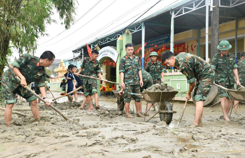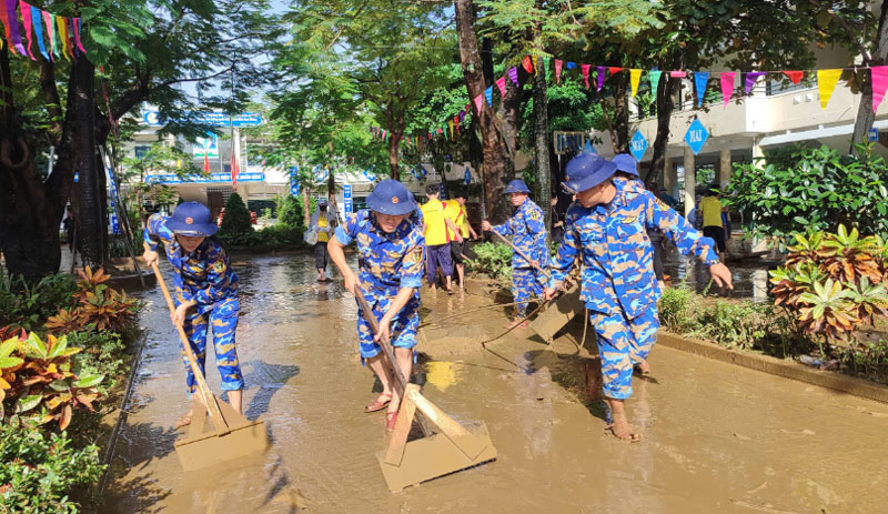 A Da Nang Városi Katonai Parancsnokság tisztjei és katonái segítenek a Nguyen Duc Thieu Általános Iskolának a Dai Loc községben a sár eltakarításában.