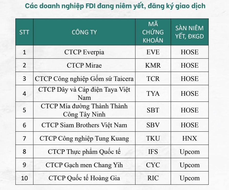 A kezdeti időszakban, 2003 és 2017 között, 11 FDI vállalat volt jegyezve a vietnami tőzsdén. Jelenleg a számuk továbbra is 10, ebből 6 a HoSE-n, 1 a HNX-en és 3 az UPCoM-on jegyzett. „Mennyiséget és nagyságrendet tekintve az FDI csoport még mindig nagyon kis hányadot képvisel a piacon lévő 1600 vállalathoz képest, ami nem tükrözi a csoport valódi potenciálját” – mondta Phuong asszony.