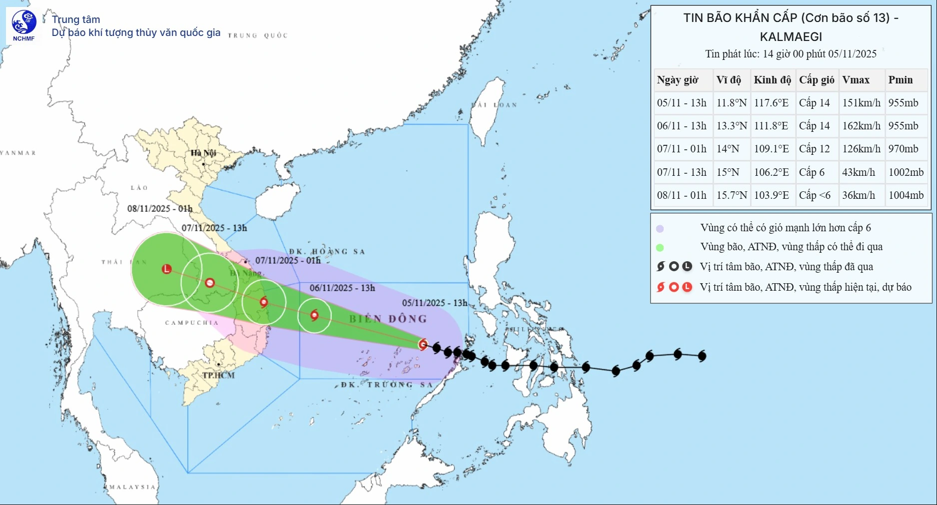 Menurut Pusat Nasional untuk Prakiraan Hidro-Meteorologi (NCHMF), pada pukul 1 siang hari ini (5 November), pusat badai Kalmaegi (nomor 13) terletak sekitar 11,8 derajat lintang utara dan 117,6 derajat bujur timur, sekitar 360 km timur Pulau Song Tu Tay (di zona khusus Truong Sa).