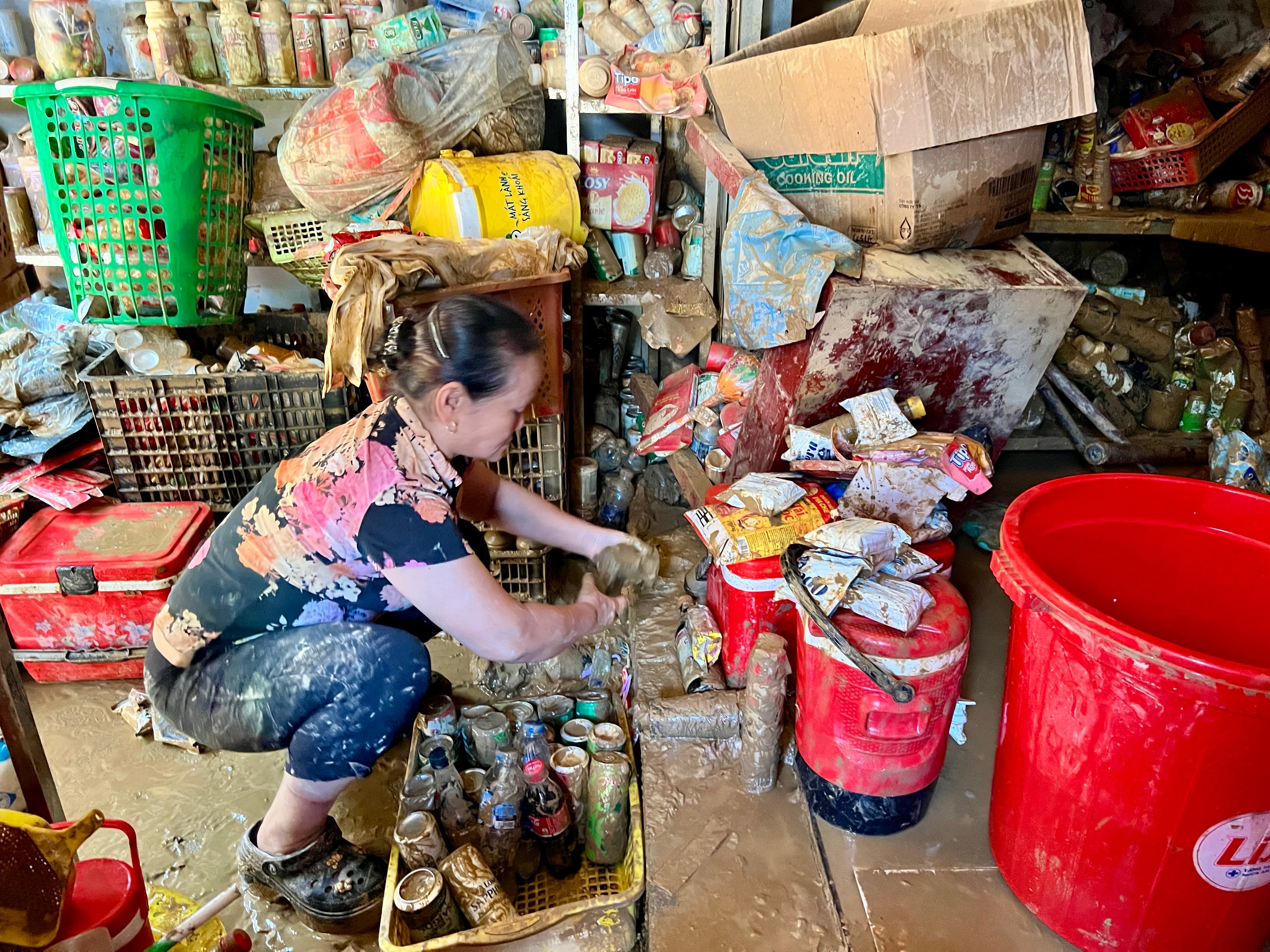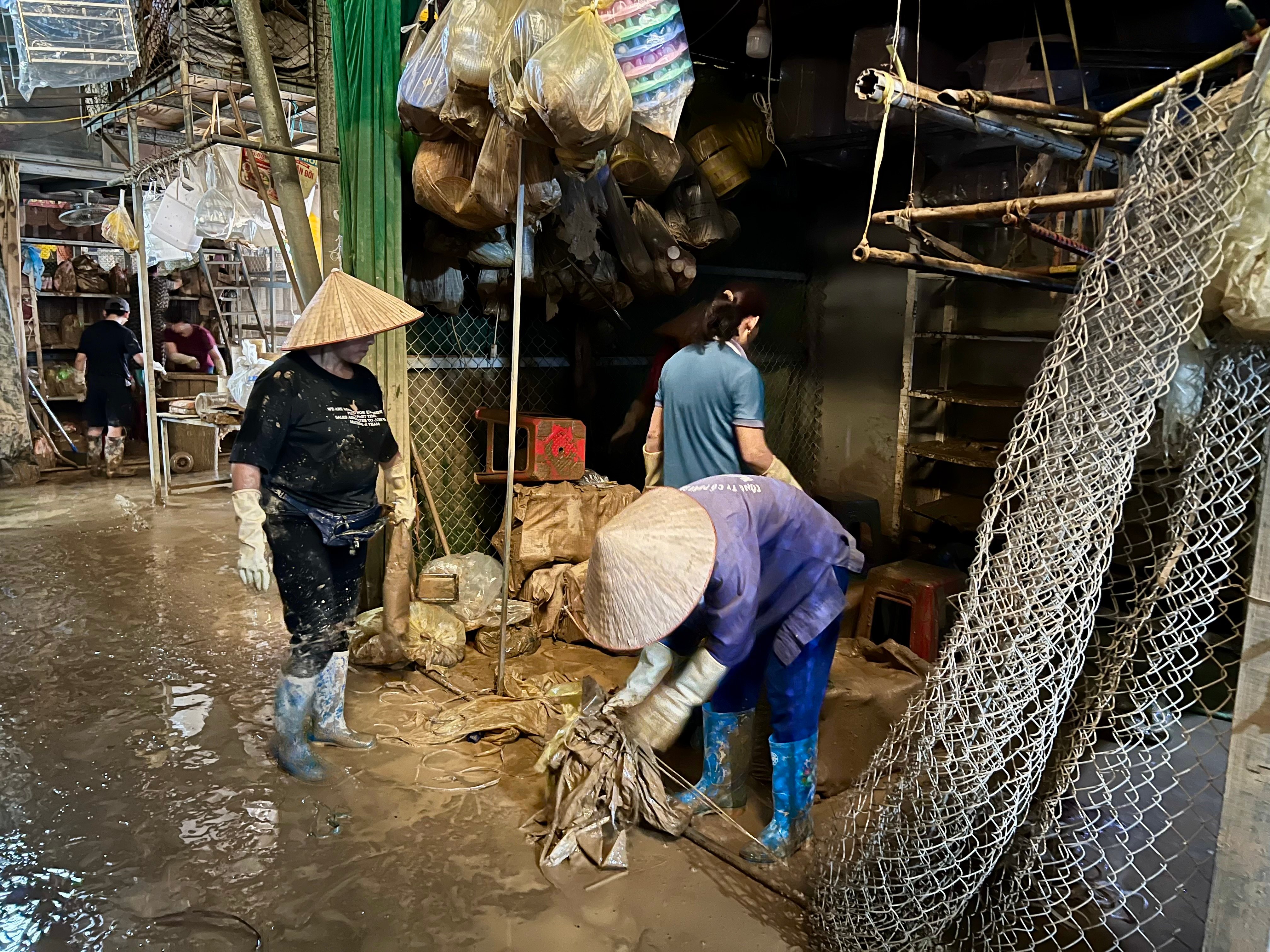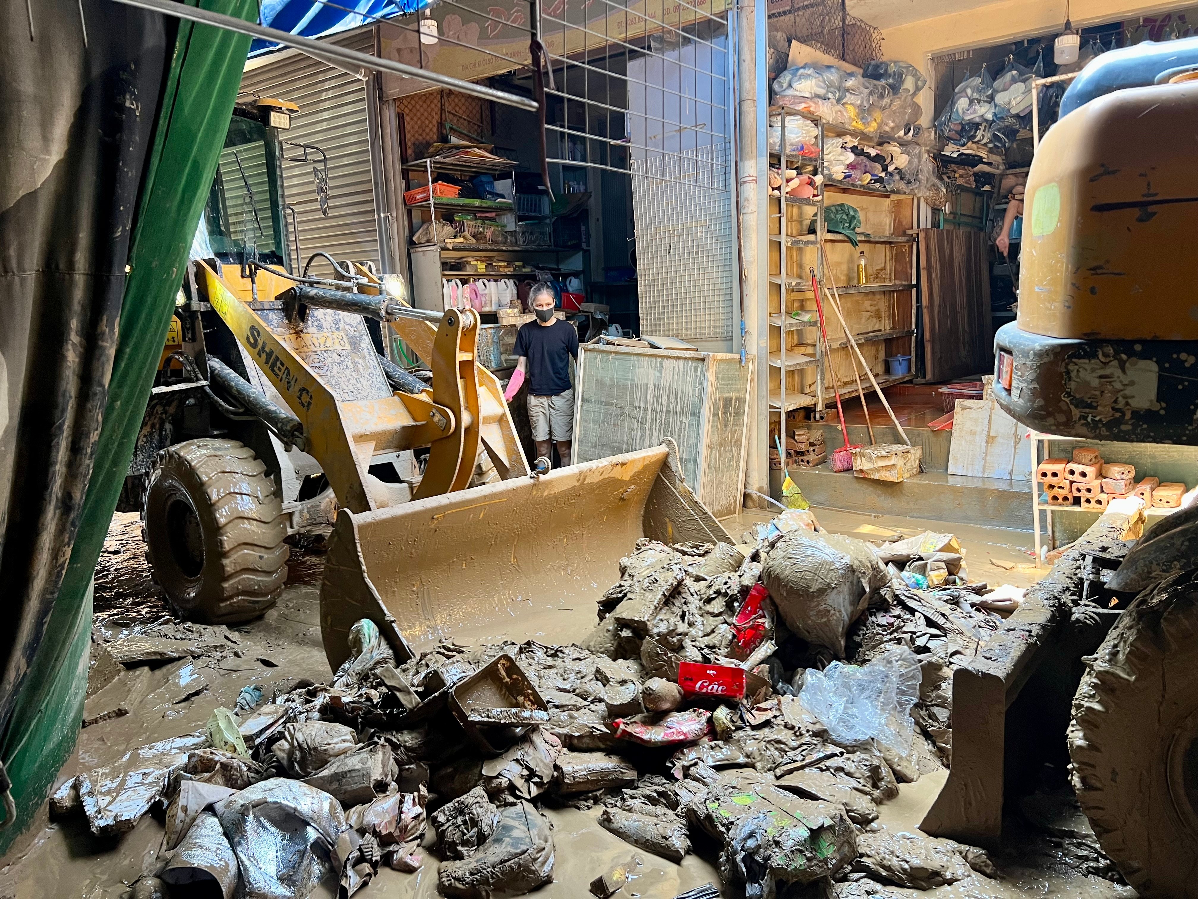 Ibu Do Thi Hoa, yang berjualan pakaian di tengah pasar, berkata sambil menangis, "Toko saya baru saja mengimpor pakaian untuk persiapan musim dingin, semuanya basah kuyup dan rusak. Puluhan pakaian baru, mantel, sepatu wol, dan perlengkapan tidur kini basah kuyup dan berlumpur. Perkiraan kerugiannya sekitar 700 juta VND. Kerugiannya total. Sekarang saya harus membawa pakaian saya ke binatu dan saya tidak tahu apakah ada yang mau membelinya."