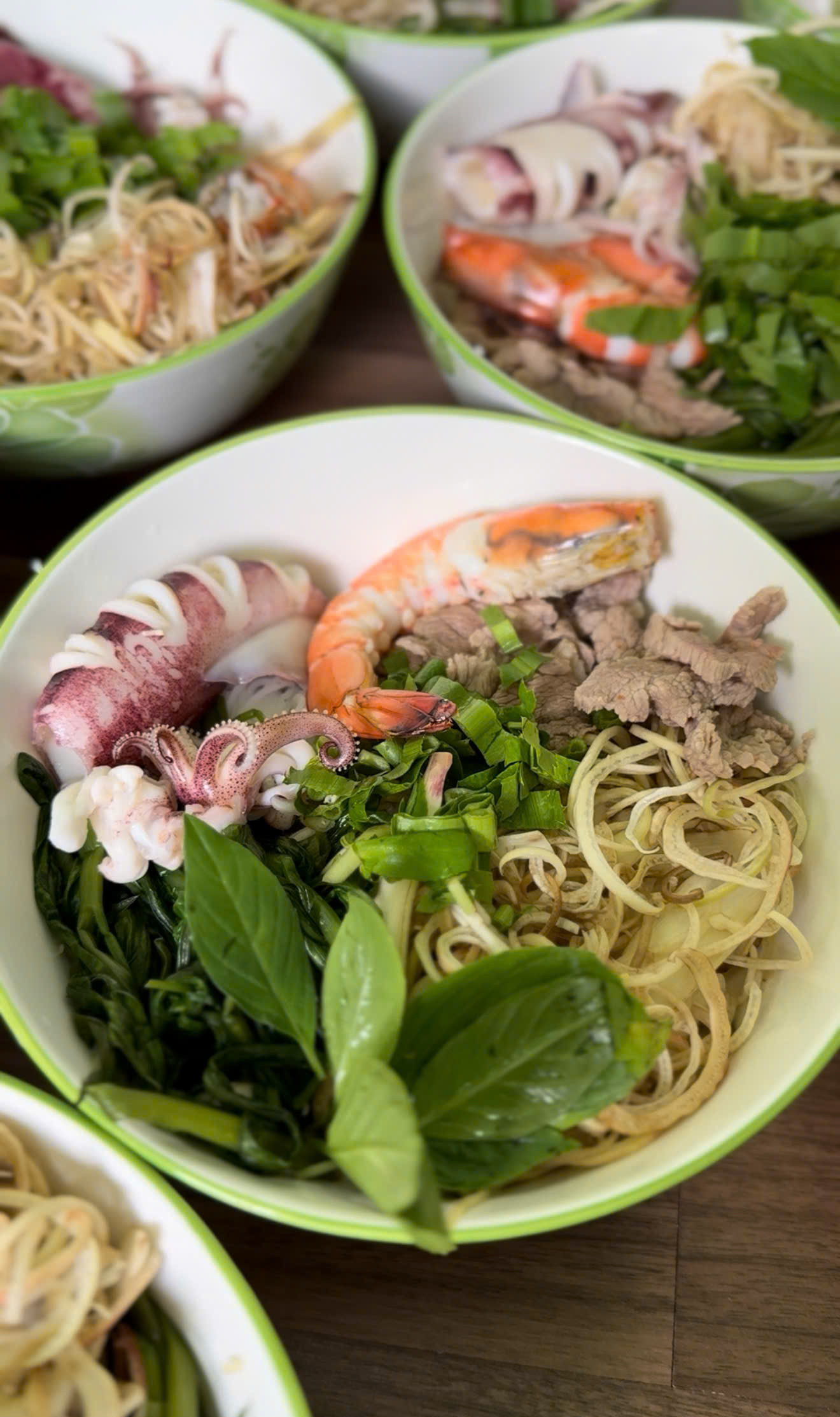 Dari pho daging sapi, mi seafood Thailand, mi Quang, mi rebung bebek, kue beras udang dan babi, sandwich bakso hingga bebek panggang dengan daun mac mat, mi goreng seafood, sup kepiting..., dia memasak semuanya dengan terampil dan percaya diri.