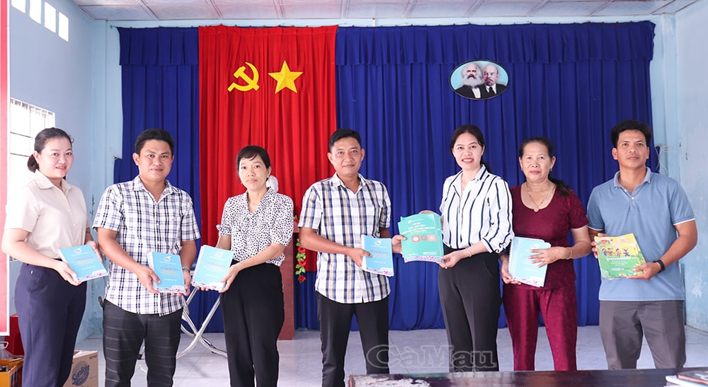 Ibu To Thi My Thuan, Wakil Presiden Serikat Wanita Provinsi (ketiga dari kanan), menyerahkan buku pegangan dan materi propaganda tentang kesetaraan gender dan pencegahan kekerasan dalam rumah tangga kepada kelompok Alamat Tepercaya Komunitas.