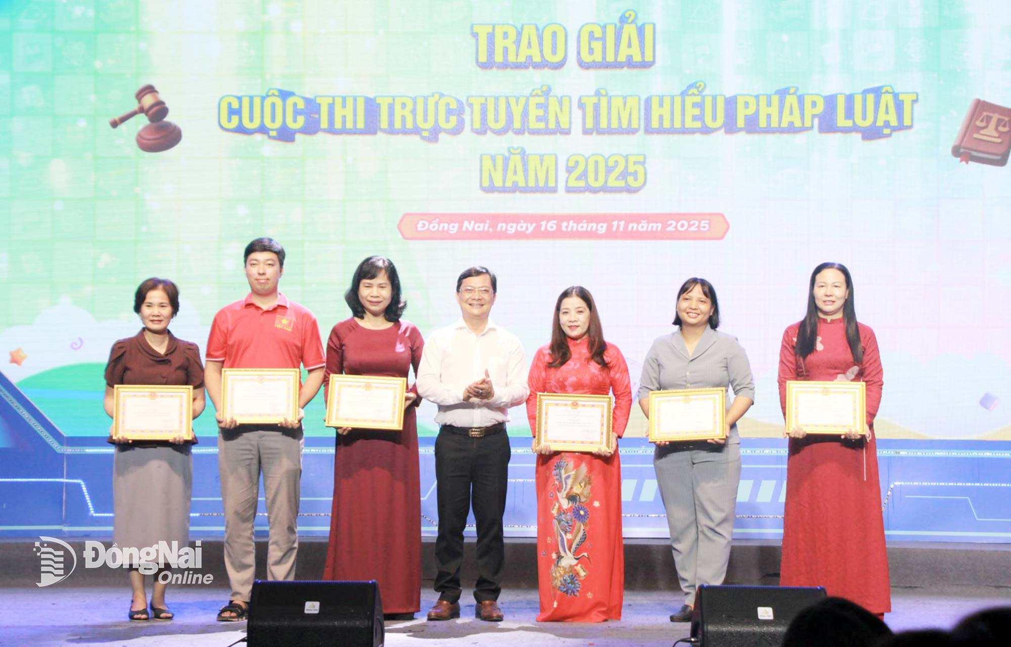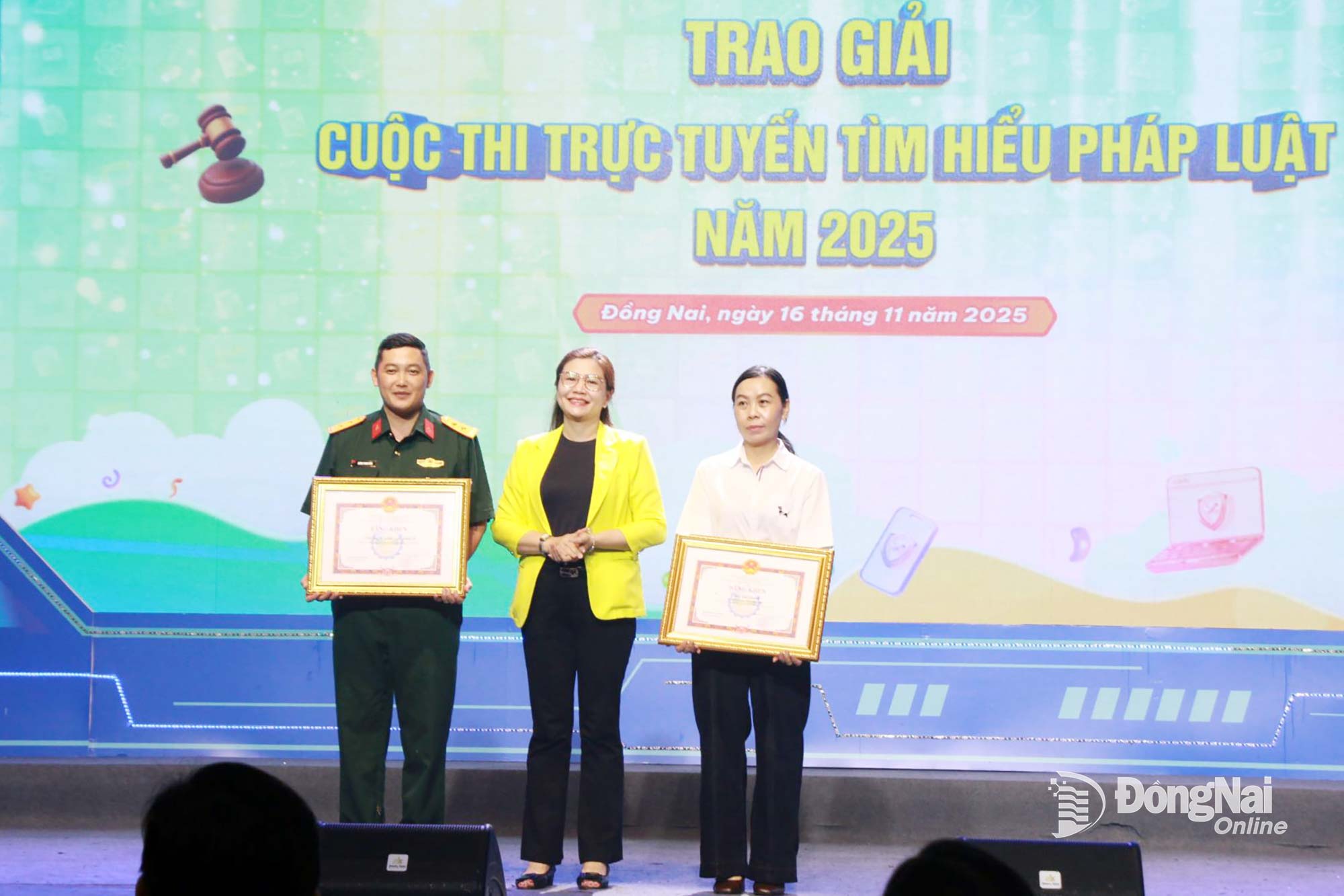 | Wakil Direktur Departemen Kehakiman Dong Nai, Ly Hau Hong Le, memberikan sertifikat penghargaan dari Komite Rakyat Provinsi kepada kolektif dan individu yang memenangkan hadiah pertama dalam Kontes Pembelajaran Hukum Daring 2025. Foto: Nga Son |