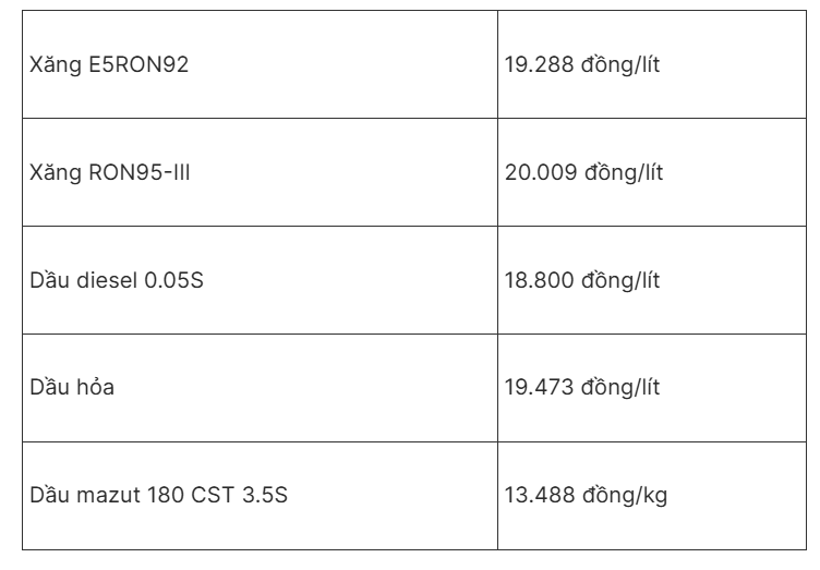 Di dalam negeri, kemarin sore, Kementerian Keuangan dan Kementerian Perindustrian dan Perdagangan secara serentak menyesuaikan harga eceran produk BBM. Akibatnya, harga bensin E5 RON92 turun 519 VND/liter, bensin RON95-III turun 533 VND/liter, solar turun 1.026 VND/liter, minyak tanah turun 815 VND/liter, dan bahan bakar minyak turun 251 VND/kg.